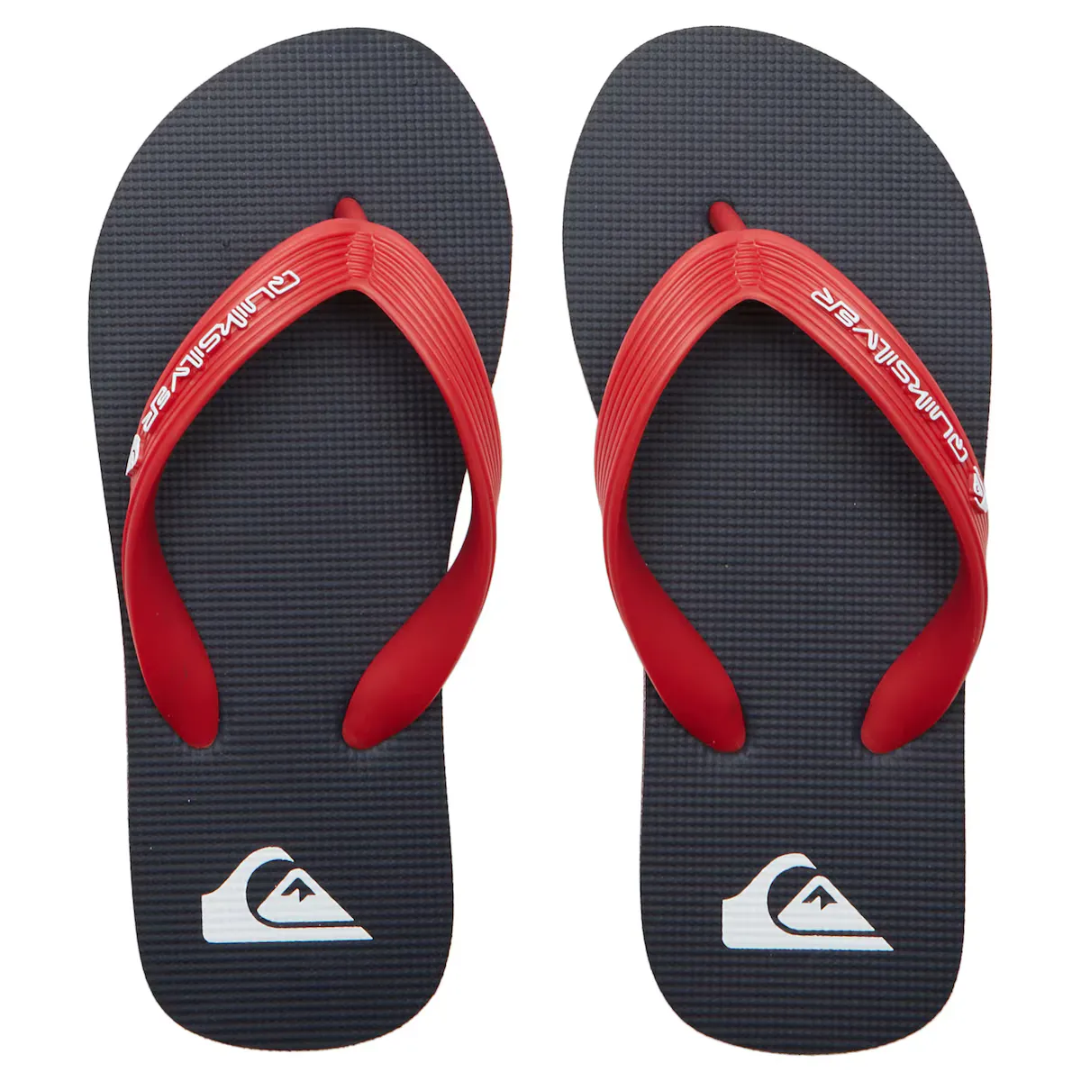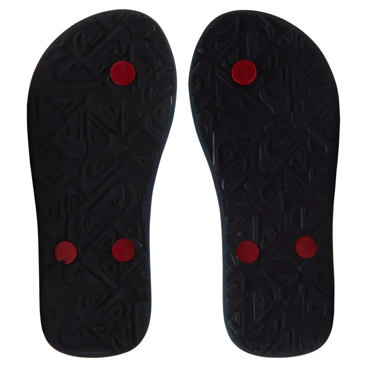 Шлепанцы для детей. Особенности включают: Верх: синтетический, Стелька: нескользящая стелька с текстурами, Верхние детали: синтетический и гибкий трехточечный резиновый ремешок, Подошва: цепкая резиновая подошва с многоугольными насечками с логотипом для дополнительного сцепления, Бренд: надпись Quiksilver и логотип Mountain Wave и другие особенности: тонкие линии в согласованных поп-цветах на боковой стороне подошвы.