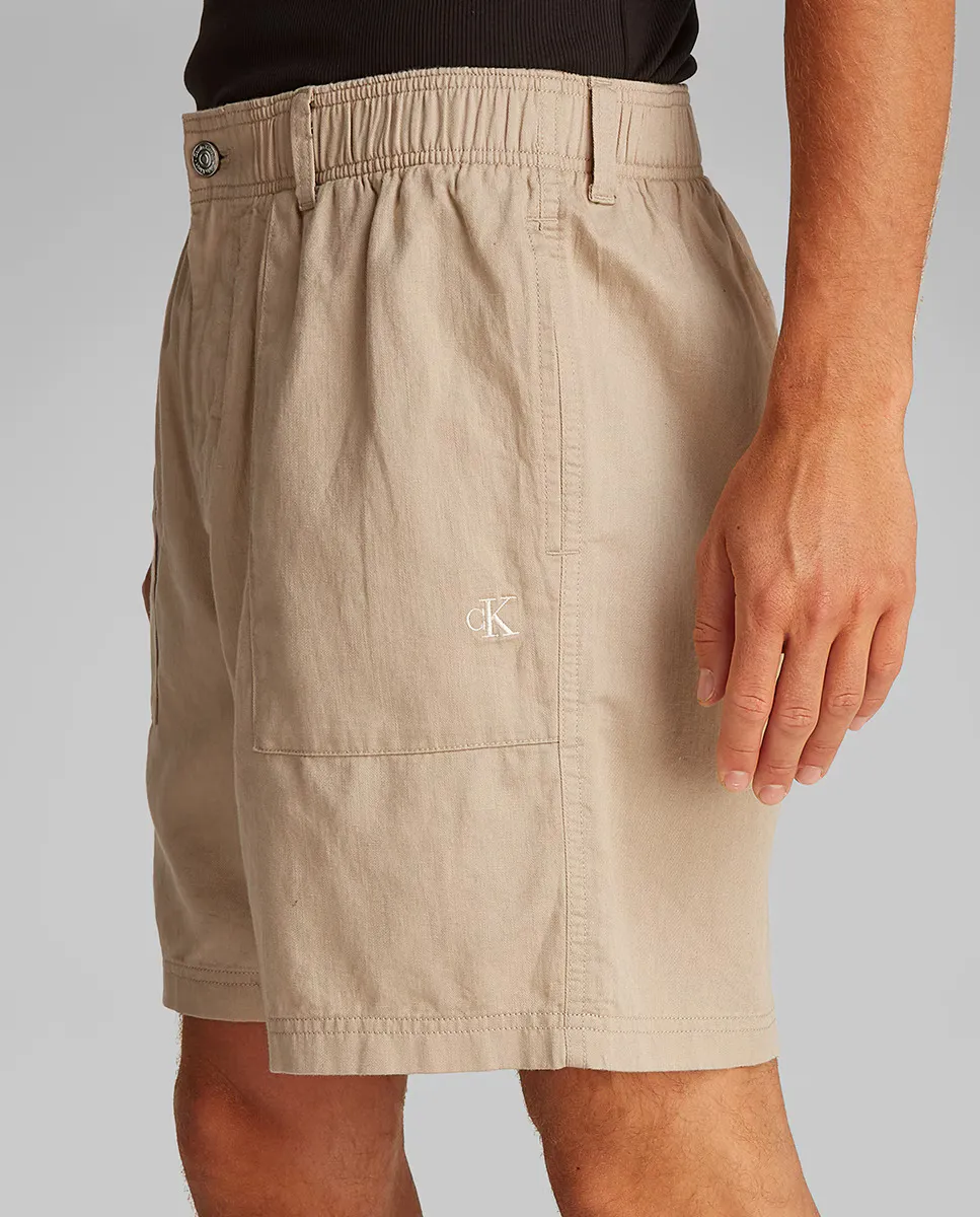 Мужские шорты изо льна с обычным кроем, застежкой на пуговицы и ширинкой на молнии. Передние и задние накладные карманы и вышитый логотип CK в тон на переднем кармане.