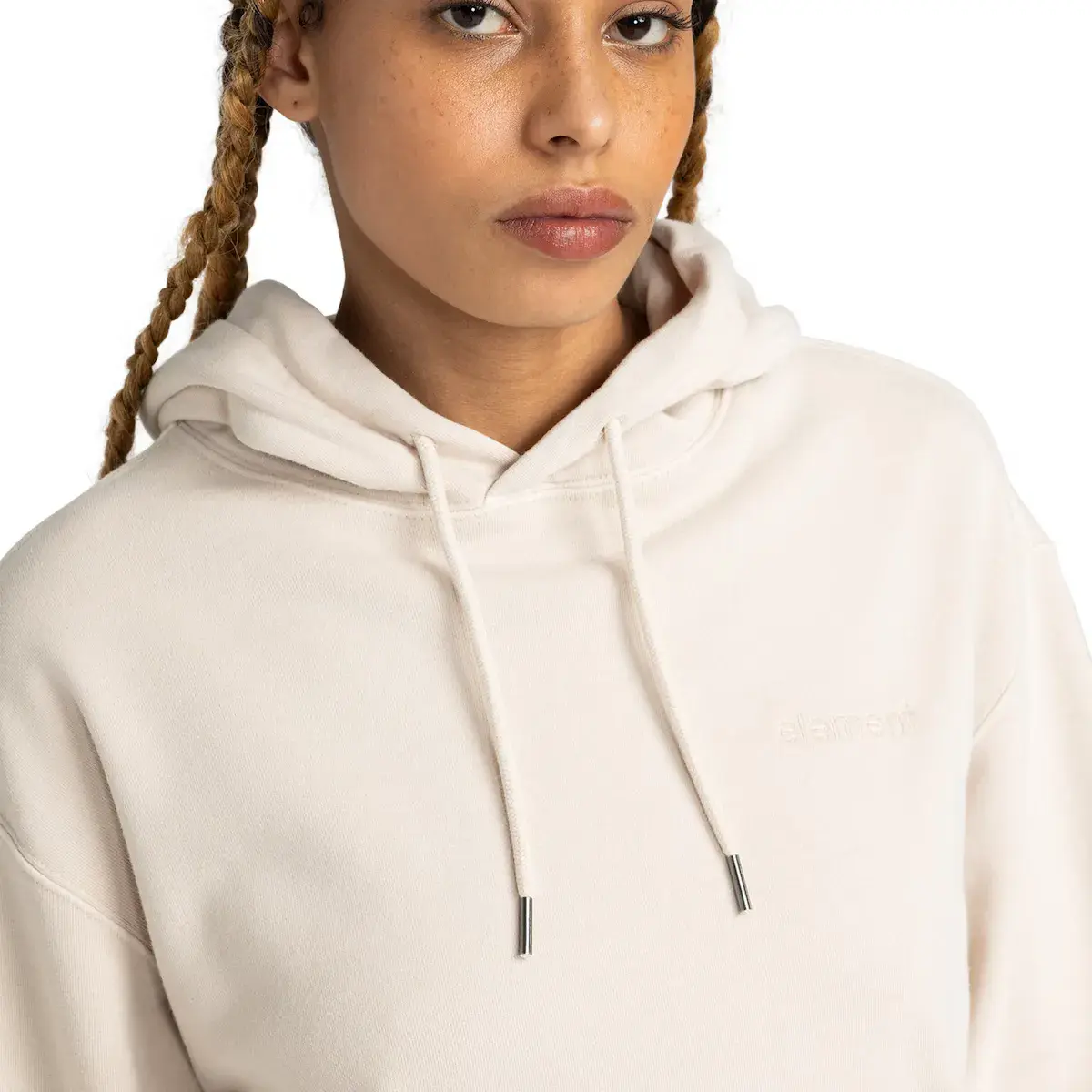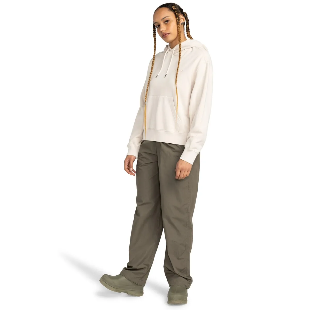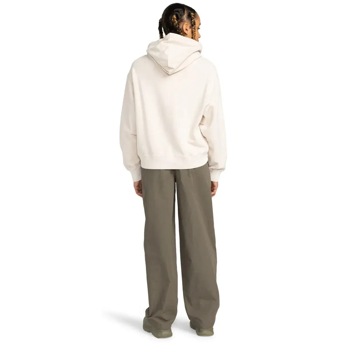 Женская толстовка. Особенности включают: Коллекция: Основная коллекция, Ткань: Нечесаная френч-махровая ткань 50% переработанный хлопок 30% хлопок 20% переработанный полиэстер [350 г/м2], Сознательное от природы: переработанный хлопок GRS, Краситель: пигментный краситель, Крой: свободный крой, Воротник: капюшон с воротником, Капюшон: капюшон с трикотажной подкладкой, Рукава: длинные рукава, Застежка: без открывания, Карманы: карманы в стиле кенгуру, Бренд: вышитый логотип на груди, вышитые люверсы и кулиски в тон с неплетеным металлическим наконечником.
