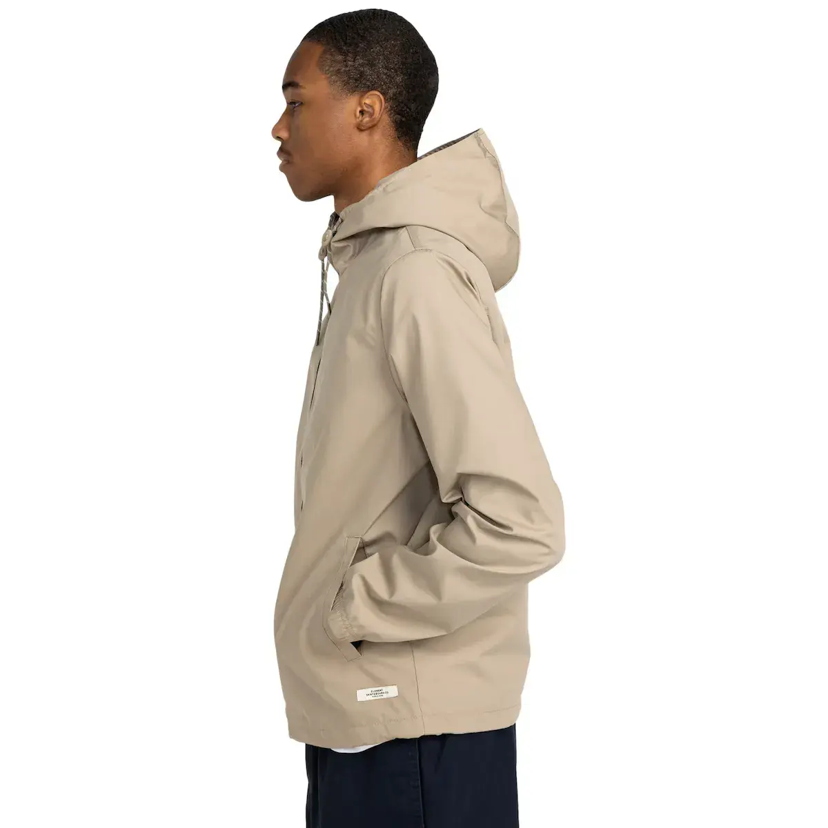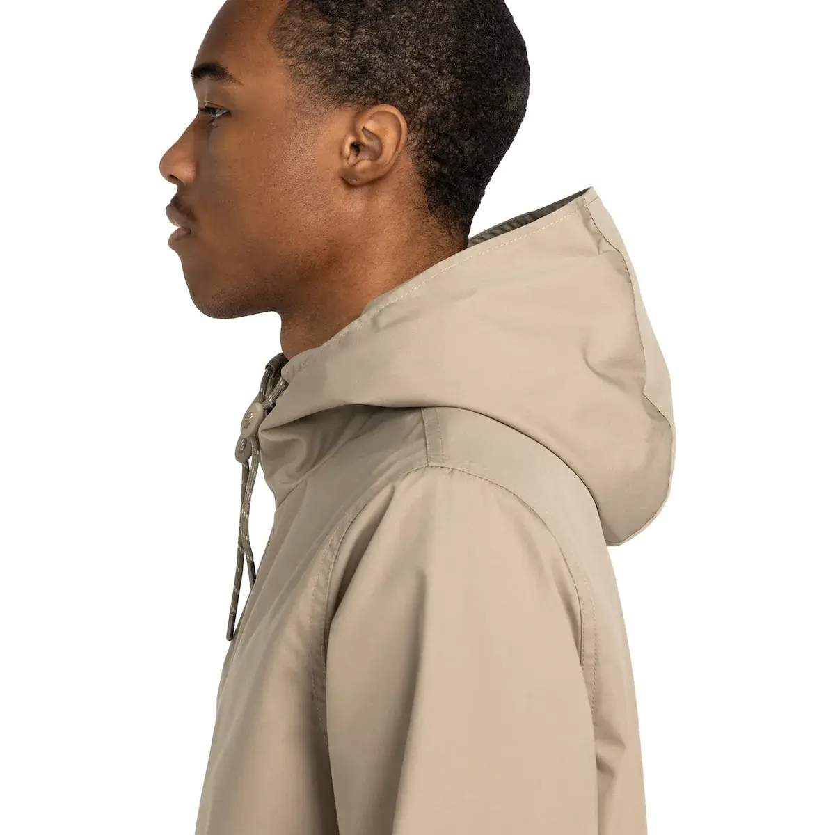 Мужская водонепроницаемая куртка-ракушка. Особенности включают: Коллекция: Основная коллекция, Ткань: Ткань из 65% переработанного полиэфирного холста и 35% хлопка (215 г/м2), Осознанная по своей природе: переработанный полиэстер GRS, Обработка: без ПФУ, Технология: водостойкая, Ветрозащитная, Водонепроницаемая: прочная водоотталкивающая обработка 5K [DWR] для обеспечения защиты, Крой: обычный крой, Воротник: капюшон с воротником, Рукава: длинные рукава, капюшон: регулируемый капюшон, Подкладка: хлопок и полиэстер поплин, Застежка: передняя застежка на молнию, Карманы: прорезные карманы, Внутренний карман, Бренд: Светоотражающий принт на груди, Другие детали: Шнурок и силиконовый регулятор и тканевая нашивка.