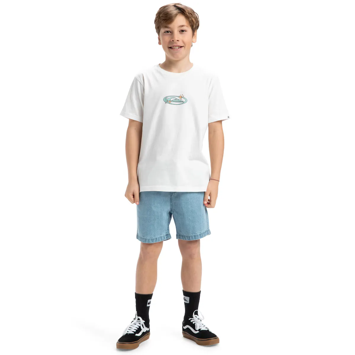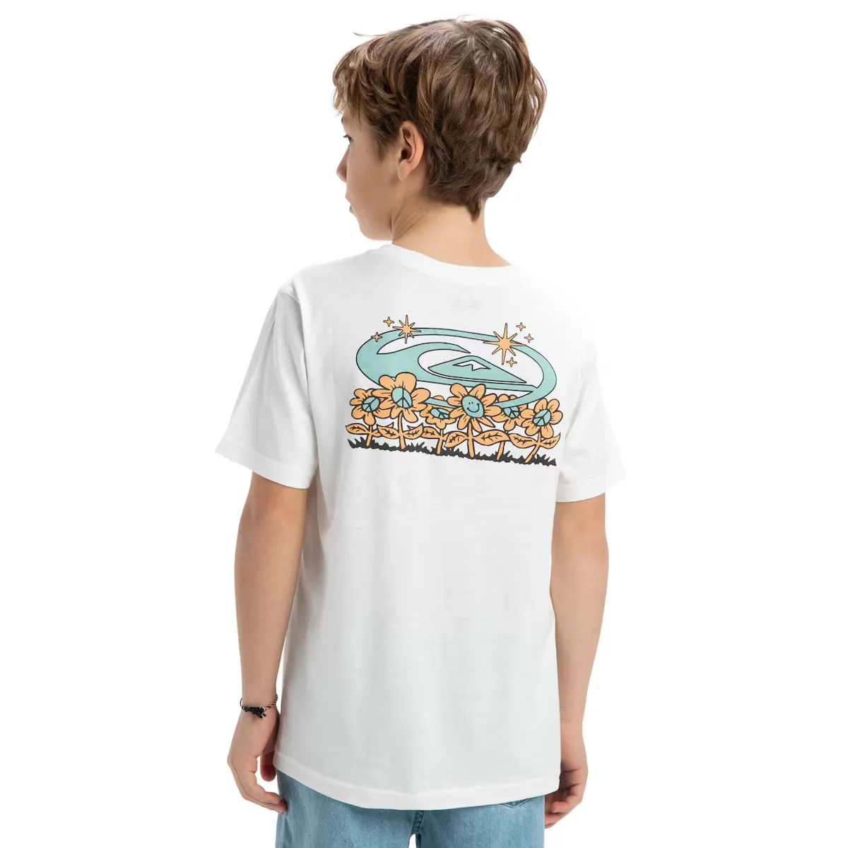 Футболка с коротким рукавом для детей от 8 до 16 лет. Особенности включают: Ткань: 100% органический хлопок [160 г/м2], крой: обычный крой, Горловина: круглый вырез, Рукава: короткий рукав, Бренд: Художественный принт Quiksilver спереди и сзади, Упаковка переработанных этикеток Quiksilver, Другие особенности: трикотаж в рубчик 1x1 на воротнике и Made Better.