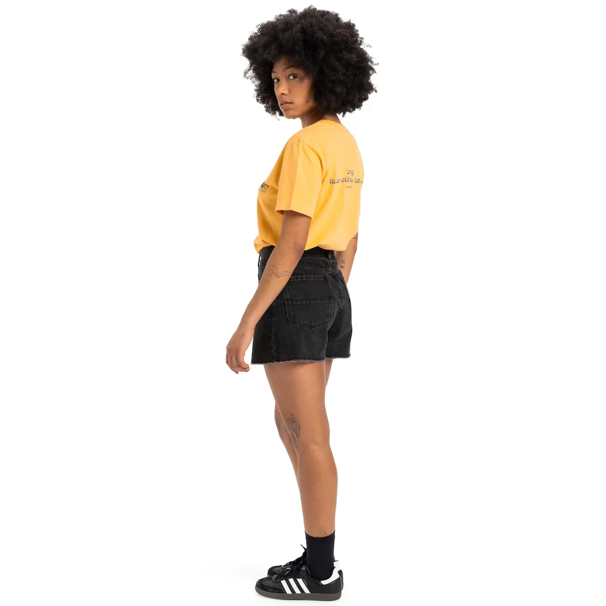 Женские джинсовые шорты. Особенности включают: Коллекция: Essentials, ткань: хлопчатобумажная джинсовая ткань, Крой: укороченный крой с высокой талией, Талия: Фиксированная талия, Застежка: Ширинка на молнии и застежка на пуговицы на талии, Карманы: 6 карманов, Бренд: Вышивка логотипа над левым боковым карманом, Кожаная нашивка на правой задней части талии и Другие детали: Нижний низ без подола.