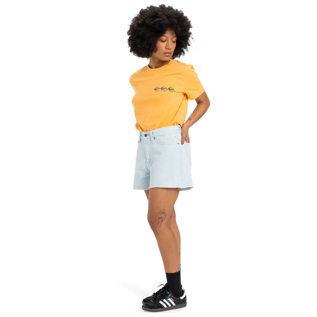 Женские джинсовые шорты. Особенности включают: Коллекция: Essentials, ткань: хлопчатобумажная джинсовая ткань, Крой: укороченный крой с высокой талией, Талия: Фиксированная талия, Застежка: Ширинка на молнии и застежка на пуговицы на талии, Карманы: 6 карманов, Бренд: Вышивка логотипа над левым боковым карманом, Кожаная нашивка на правой задней части талии и Другие детали: Нижний низ без подола.