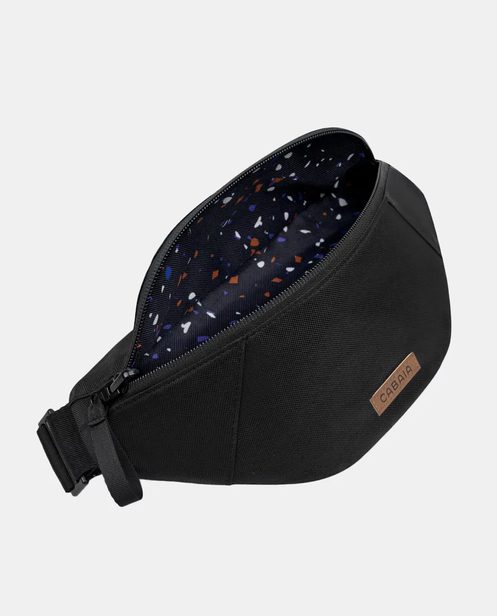 Маленькая сумка (поясная сумка) черного цвета с фирменной этикеткой Cabaia, с верхней застежкой-молнией YKK для удобного скольжения. Реверсивный: сторона с печатью и гладкая сторона. Основное отделение для предметов первой необходимости + боковой карман размером с кредитную карту. Водоотталкивающего.