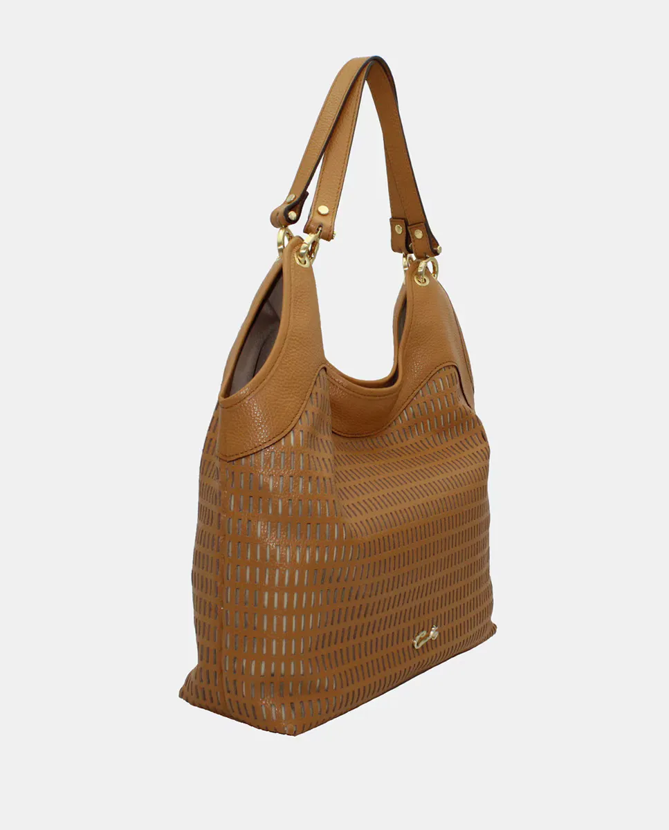Сумка-тоут из кожи с верблюжьим тиснением в сочетании с ажурной кожей в тон. Он имеет два плечевых ремня и магнитную застежку. Внутренняя часть сумки на подкладке с двумя карманами. Металлический логотип спереди и золотая фурнитура.