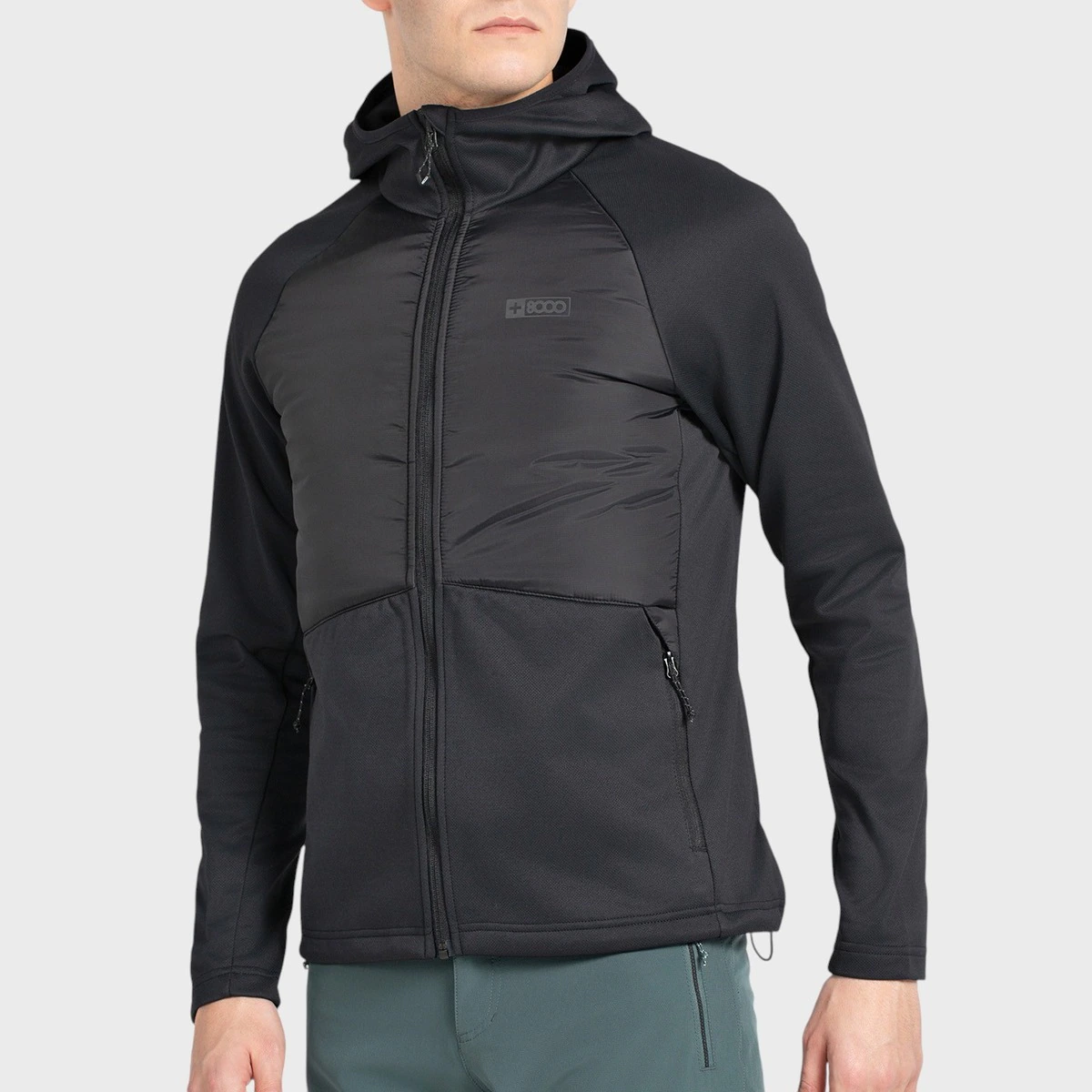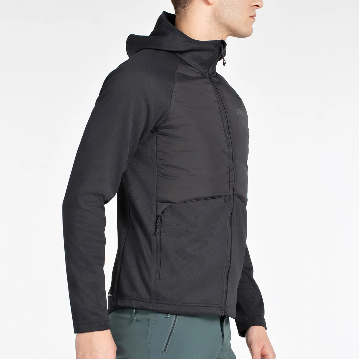 Одежда гибридной конструкции. Передняя часть в сэндвич-конструкции с синтетическим наполнителем и внешней тканью Nylon Ripstop, остальная часть одежды изготовлена из 100% полиэстера двустороннего трикотажа с полярной отделкой внутри. Прямой подол регулируемый с помощью танк, боковые карманы на молниях