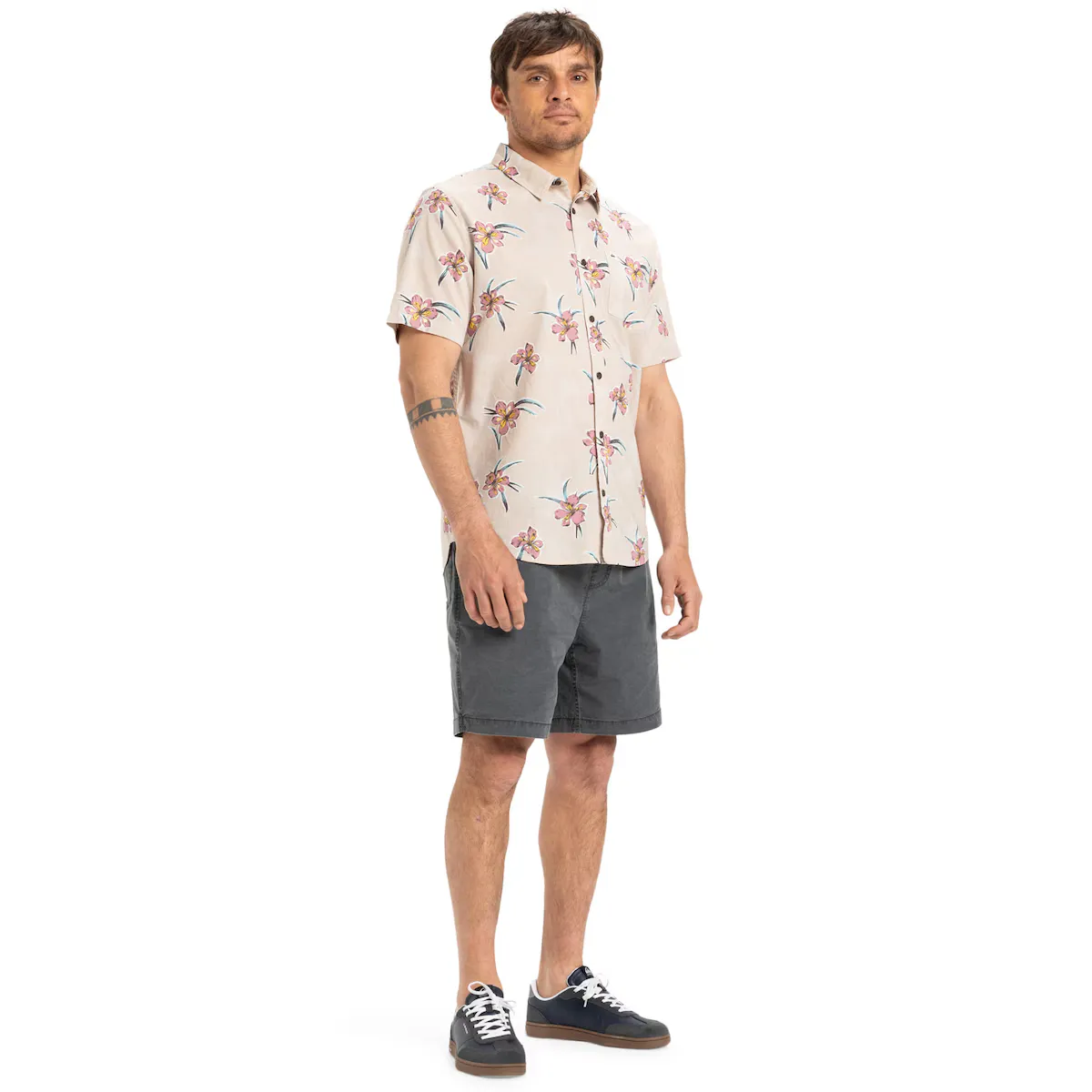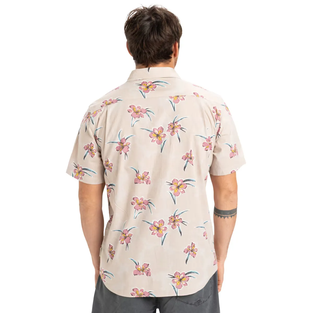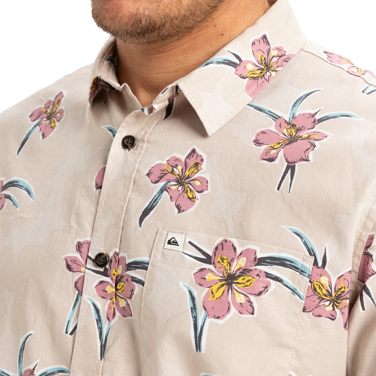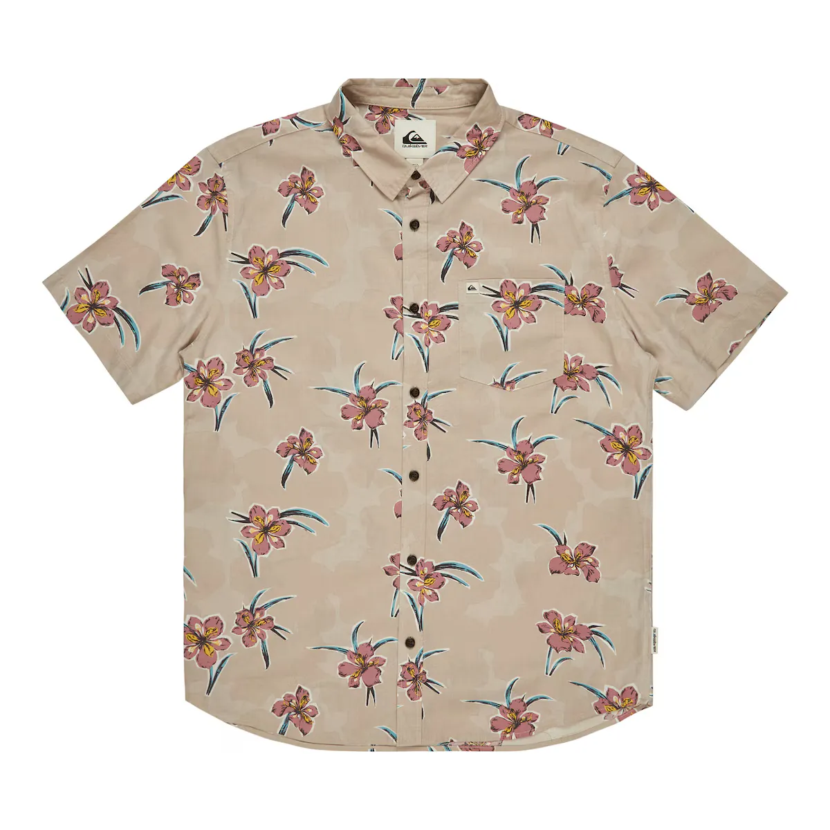 Мужская рубашка с коротким рукавом. Особенности включают: Коллекция: Образ жизни, Ткань: хлопчатобумажная тафта, стирка: стирка одежды, крой: обычный крой, Воротник: классический воротник, Рукава: короткий рукав, Карманы: Одинарный нагрудный карман, Застежка: Застежка на пуговицы, Бренд: Quiksilver этикетка на кармане и боковом шве и Другие особенности: фестоновый низ.