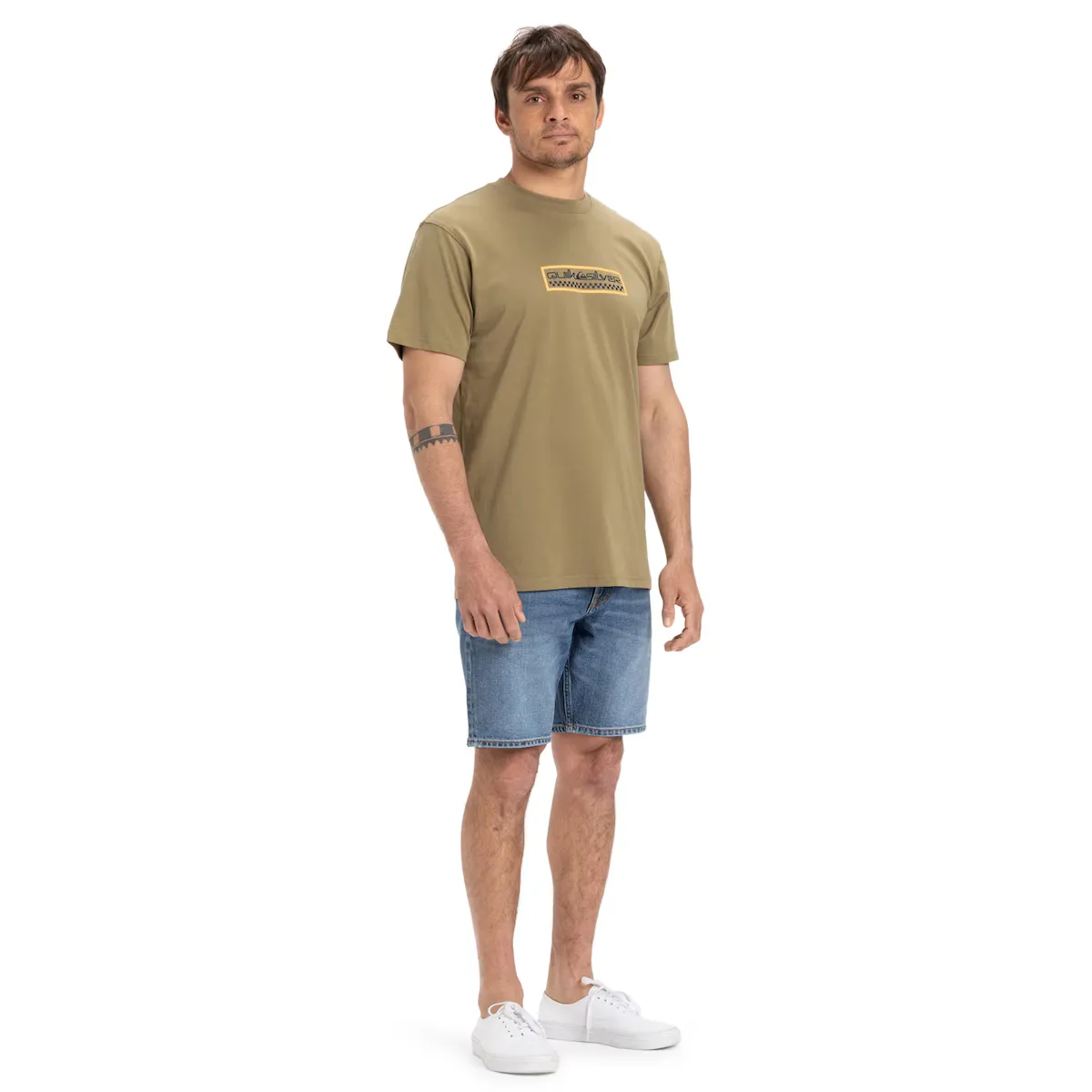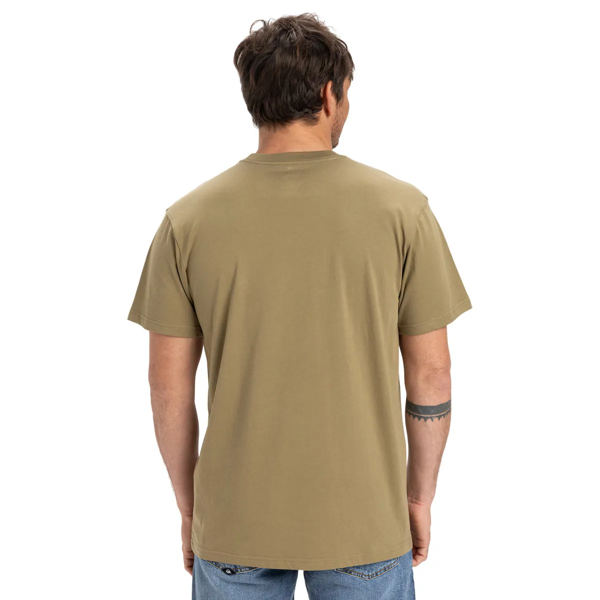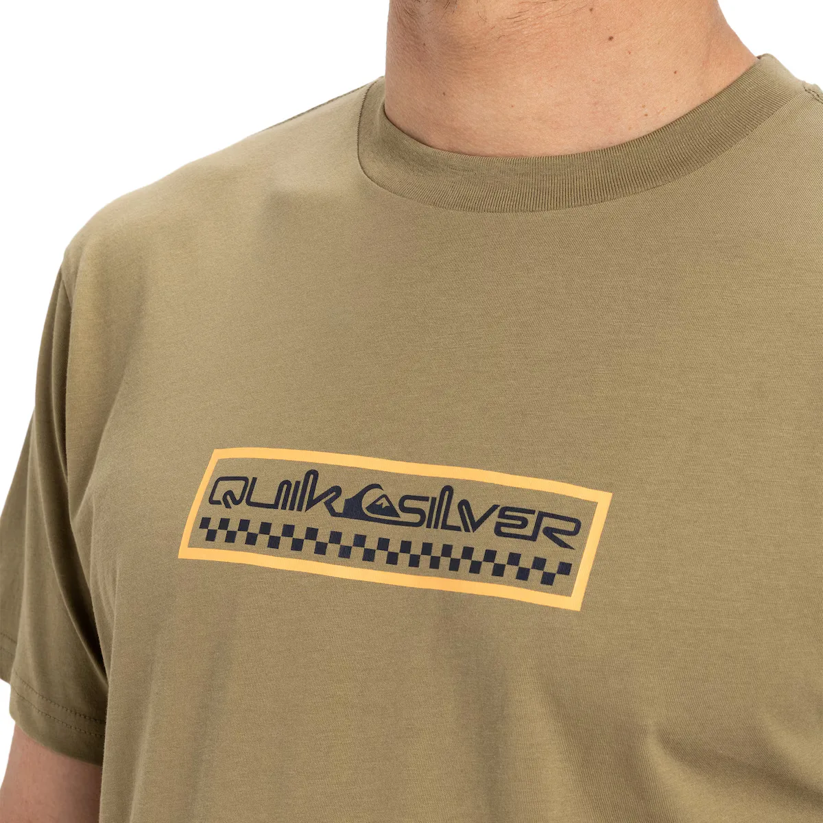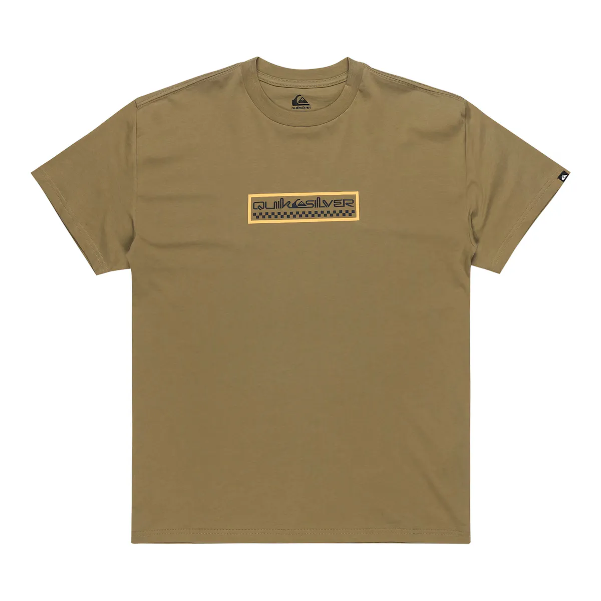Мужская футболка с коротким рукавом. Особенности включают: Ткань: трикотажное трикотажное полотно из хлопка [160 г/м2], крой: стандартный крой, Горловина: круглый вырез, Рукава: короткий рукав, Бренд: трафаретный принт на груди и этикетка Quiksilver на рукаве.