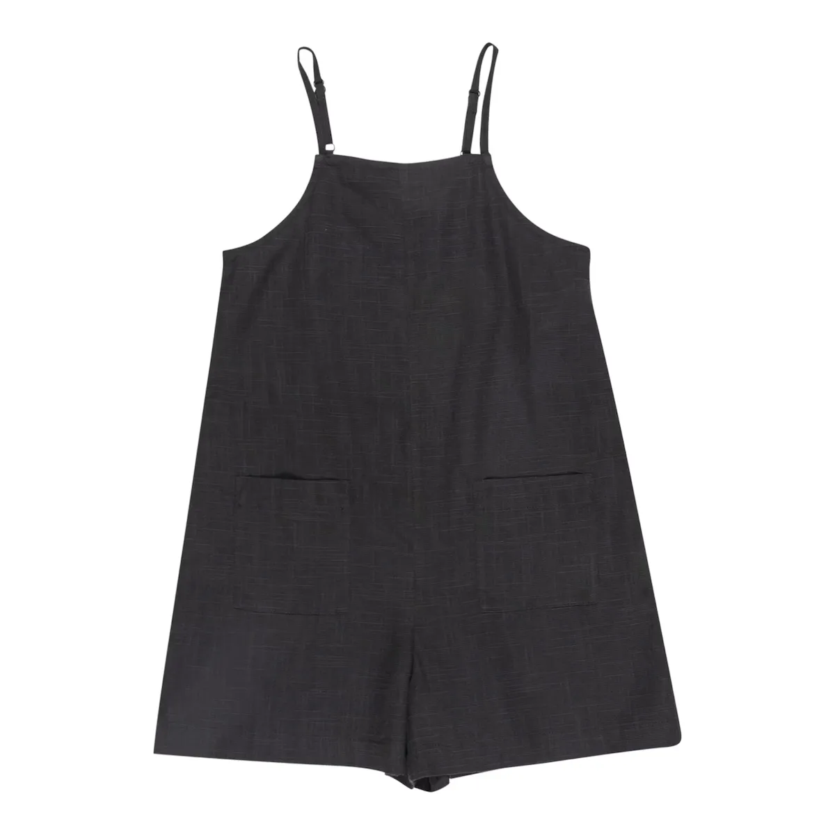 Короткий комбинезон на бретелях для детей (4 - 16 лет). Особенности включают: Ткань: Неравномерная смесь хлопчатобумажной и вискозной ткани (150 г/м2), Крой: свободный крой, Воротник: квадратный вырез, Бретели: Регулируемые бретели, Карманы: передние накладные карманы, Длина: длина с более короткой штаниной и Застежка: фиксированная застежка.
