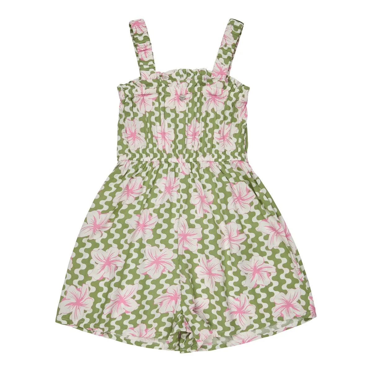Комбинезон для детей (4 - 16 лет). Особенности включают: Ткань: Обычная вискозная ткань [125 г / м2], Крой: легко надевается на дизайн, Горловина: Прямая горловина, Талия: Эластичная талия, Ремни: Собранные приталенные эластичные бретели, Длина: Длина с более короткой штаниной, Застежка: фиксированная застежка и Другие особенности: Деталь с небольшими рюшами на спине.