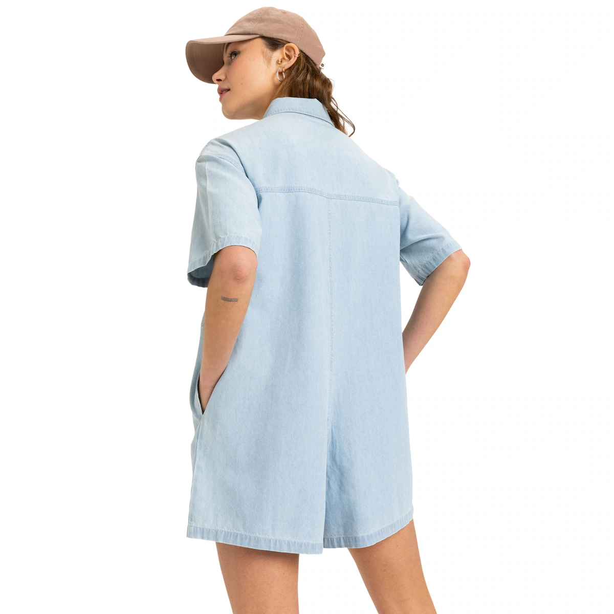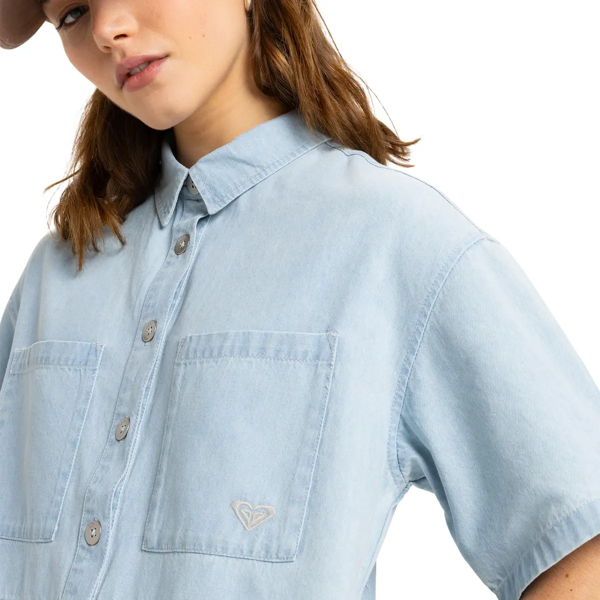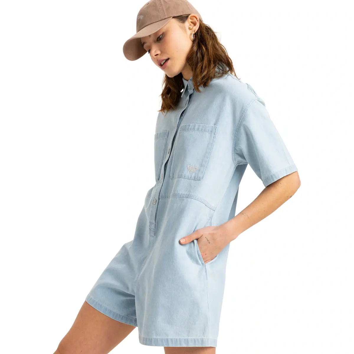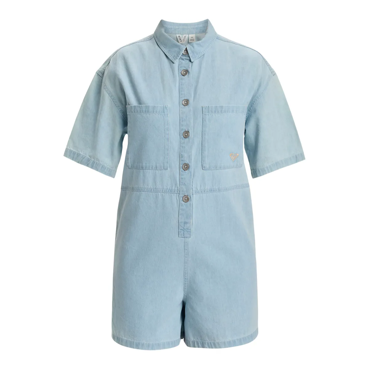 Женский джинсовый короткий комбинезон. Особенности включают: Ткань: Джинсовая ткань с легкой стиркой (7 унций), крой: свободный крой, Рукава: спущенные плечи, Застежка: Переднее отверстие с металлическими пуговицами Roxy, Карманы: накладные карманы на груди, Боковые карманы, Длина: длина с более короткой ногой и бренд: Вышивка спереди с логотипом Roxy на нагрудном кармане.