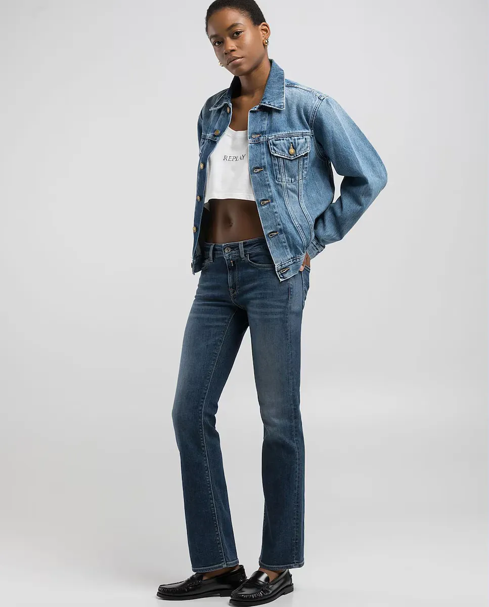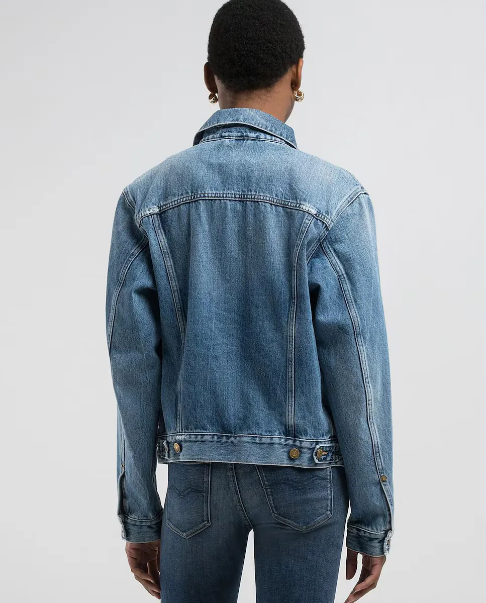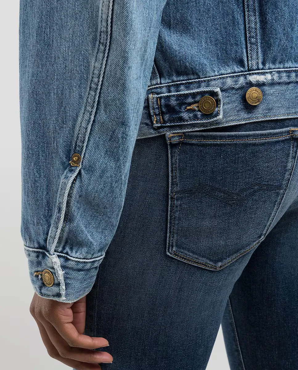 Куртка изготовлена из частично переработанного хлопкового денима цвета индиго весом 12 унций для большей экологичности. Модель имеет обработку камнями среднего оттенка с финальным смягчителем. Для одежды характерны небольшие разрывы в карманах и подол, а также цветовые контрасты в местах ношения. Дизайн дополнен двумя передними карманами с клапаном и пуговицами и регуляторами застежки внизу одежды.