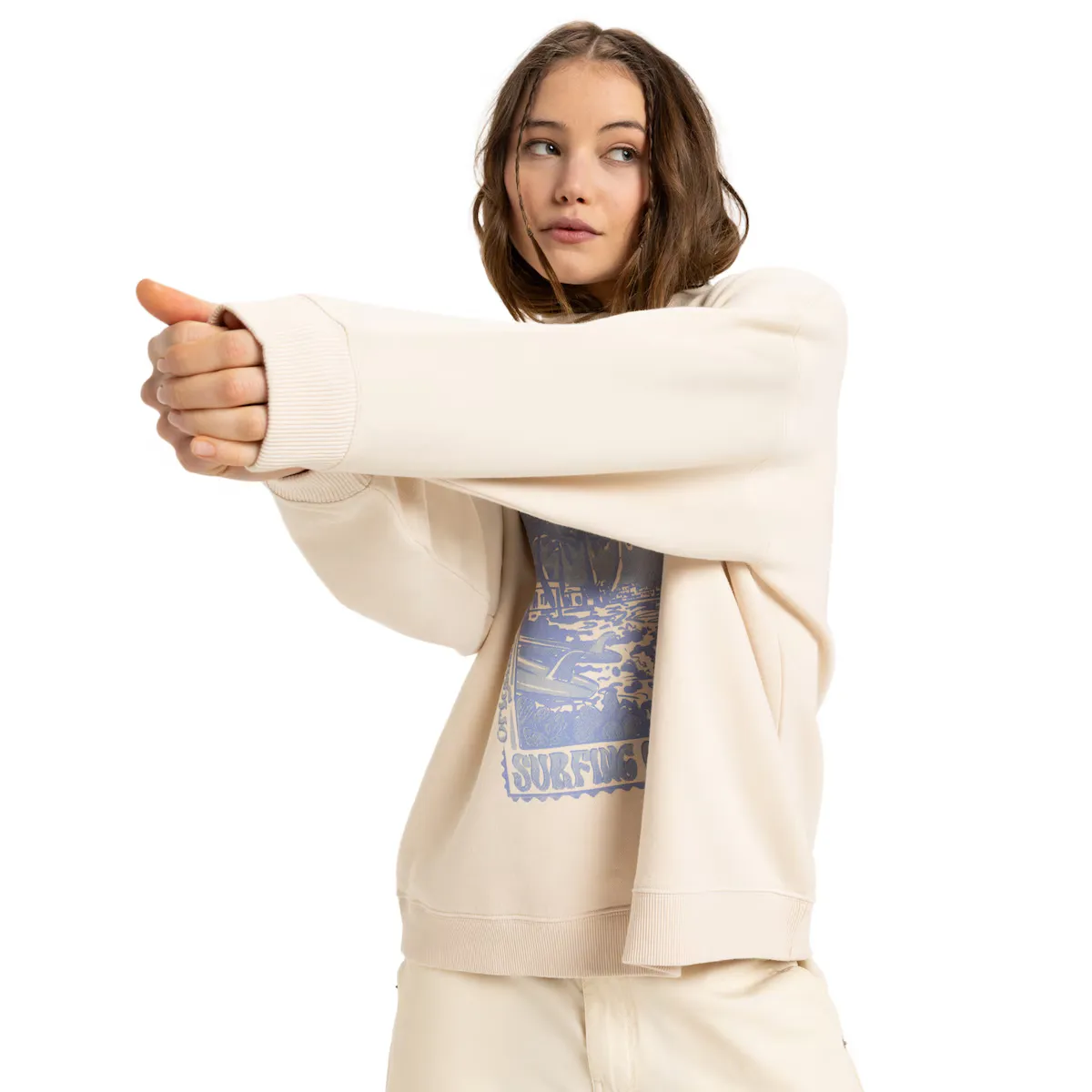 Женская толстовка с круглым вырезом. Особенности включают: Ткань: Матовая ткань толстовки из смеси 55% хлопка, 25% переработанного хлопка, 20% переработанного полиэстера [280 г/м2], Стирка: винтажный эффект стирки, Крой: широкий крой, Горловина: Круглый вырез, Рукава: Длинные рукава, Застежка: Без застежки, Бренд: Винтажная графика спереди и сзади и Другие особенности: Ребристый низ и манжеты.