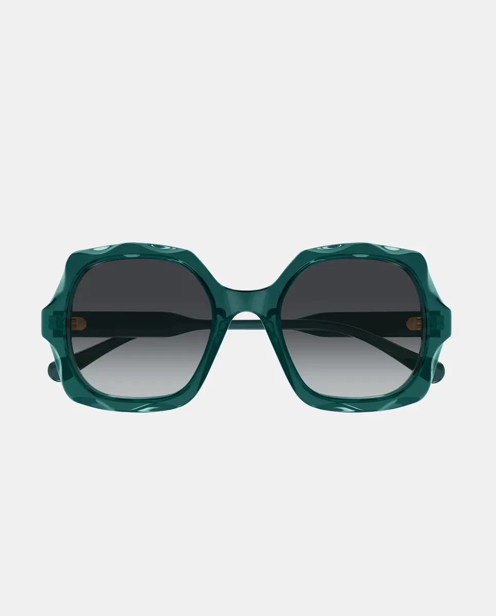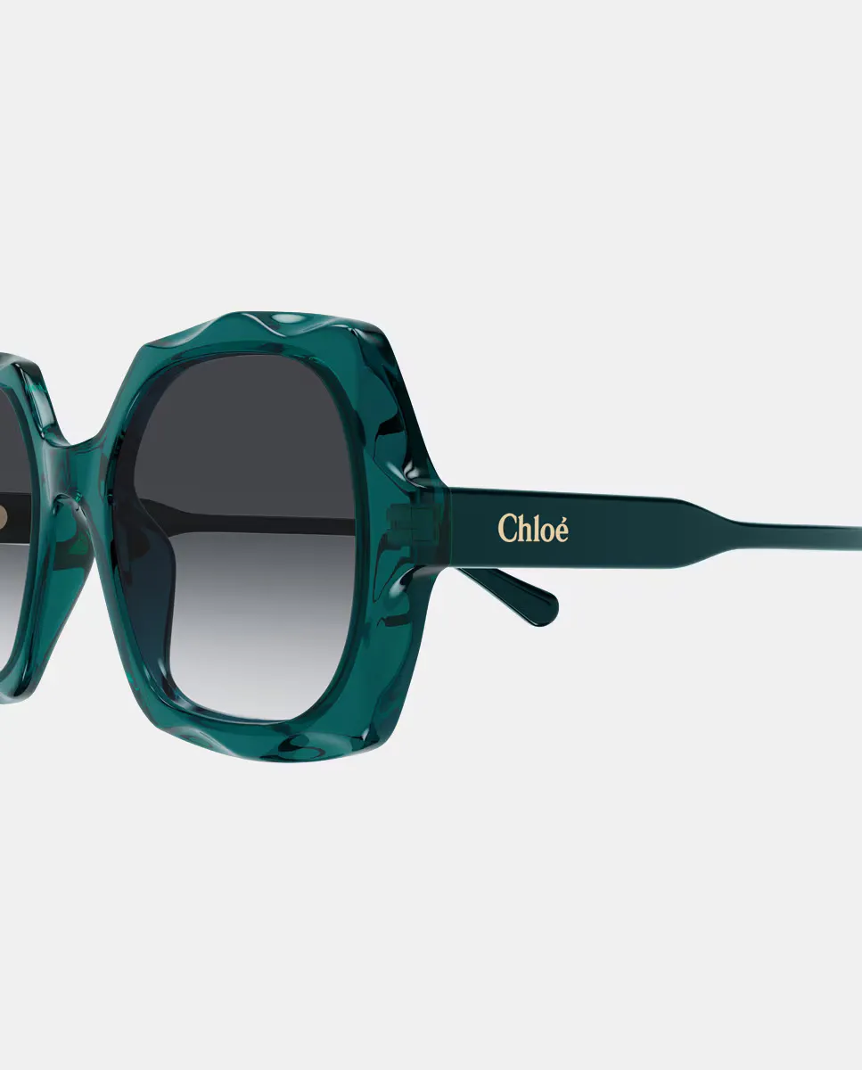 Мягкая квадратная рамка оверсайз из ацетата с мягким фестончатым узором спереди. Прозрачное сочетание цветов спереди с однотонными дужками тон в тон. Логотип Chloé с лазерной гравировкой эмали на обеих дужках.