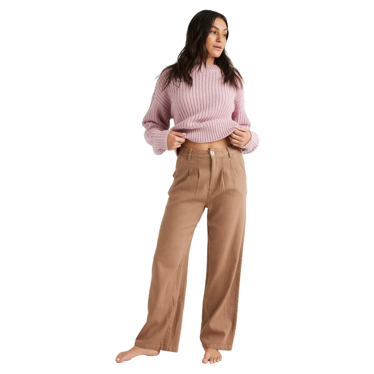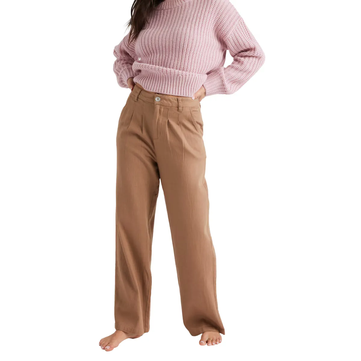 Женские брюки чиноса. Особенности включают: Ткань: Ткань Добби из хлопка со средней плотностью неравномерной пряжи (200 г/м2), Крой: Свободный крой, Нога: Широкая нога, Ширинка: передняя ширинка на молнии, Талия: Средняя посадка, талия: фиксированная талия, Застежка: Застежка на металлические пуговицы Roxy, Карманы: диагональные передние карманы, Задние карманы, Бренд: Тональная вышивка с логотипом Roxy на заднем кармане, Другие детали: Вытачки спереди и сзади с цилиндрической отделкой.