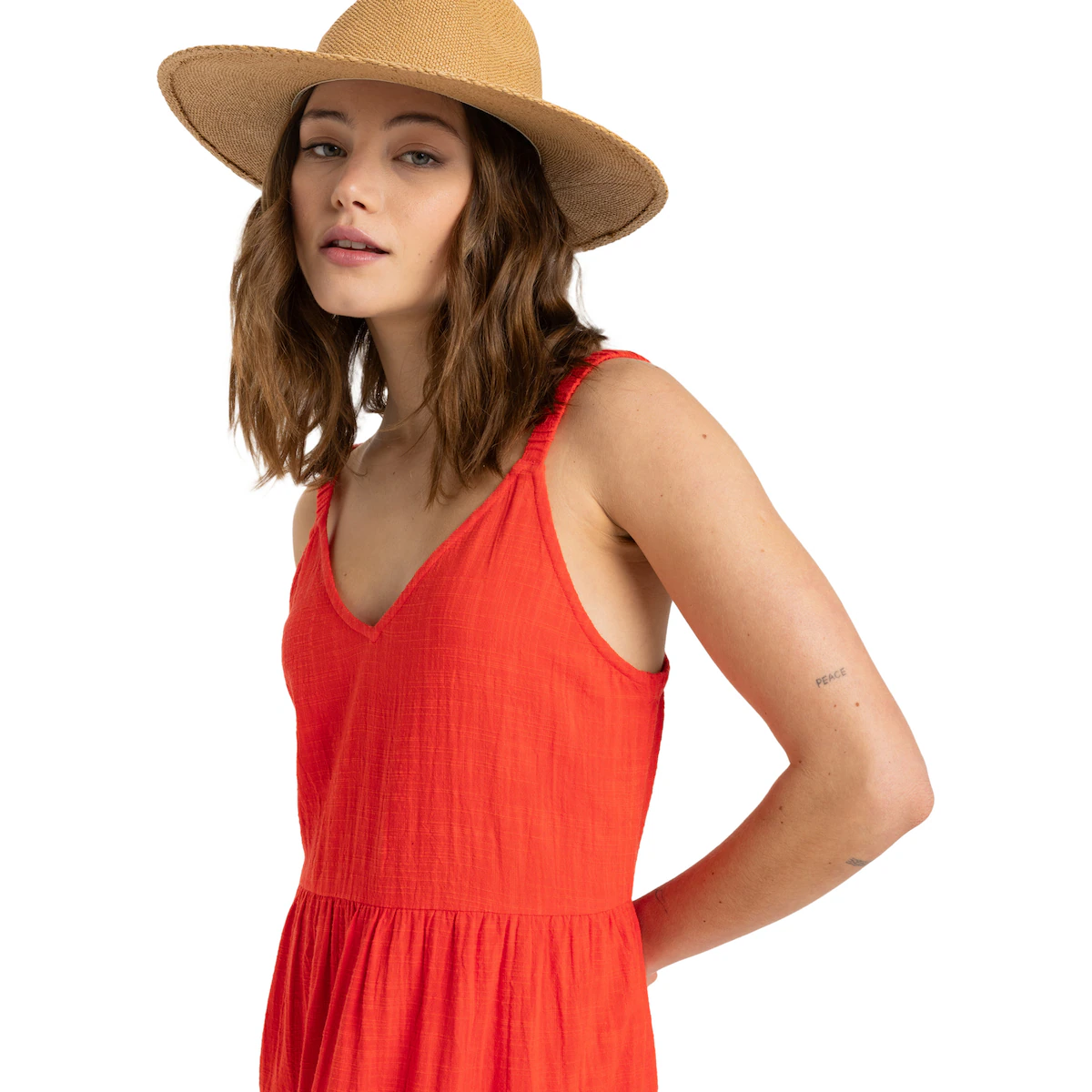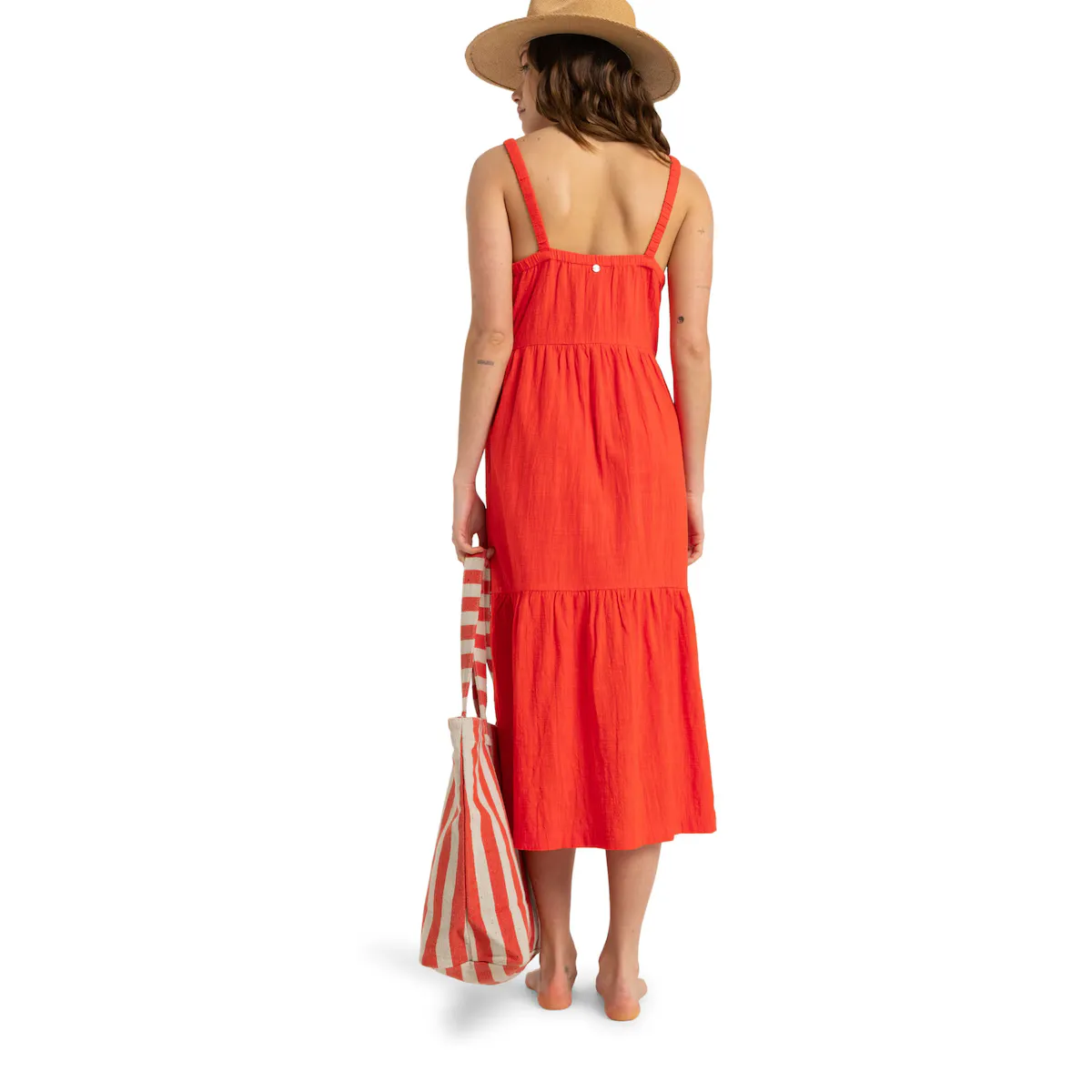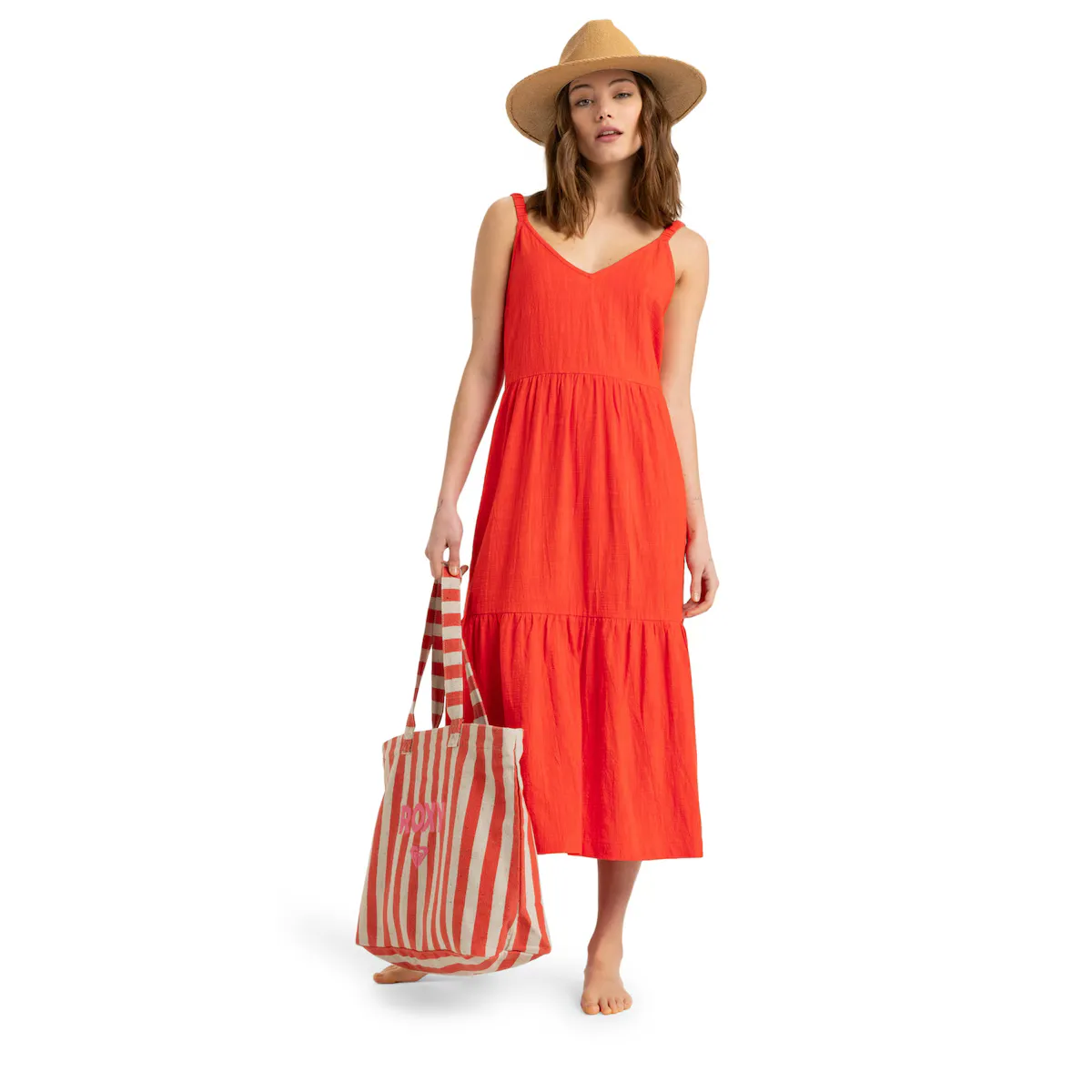 Женское платье средней длины. Особенности включают: Ткань: Смесь хлопка и вискозы (150 г/м2), Крой: Удобный трапециевидный крой, Длина: Средняя длина, Горловина: V-образный вырез, Ремни: эластичные и с покрытием и Бренд: Металлические детали Roxy.