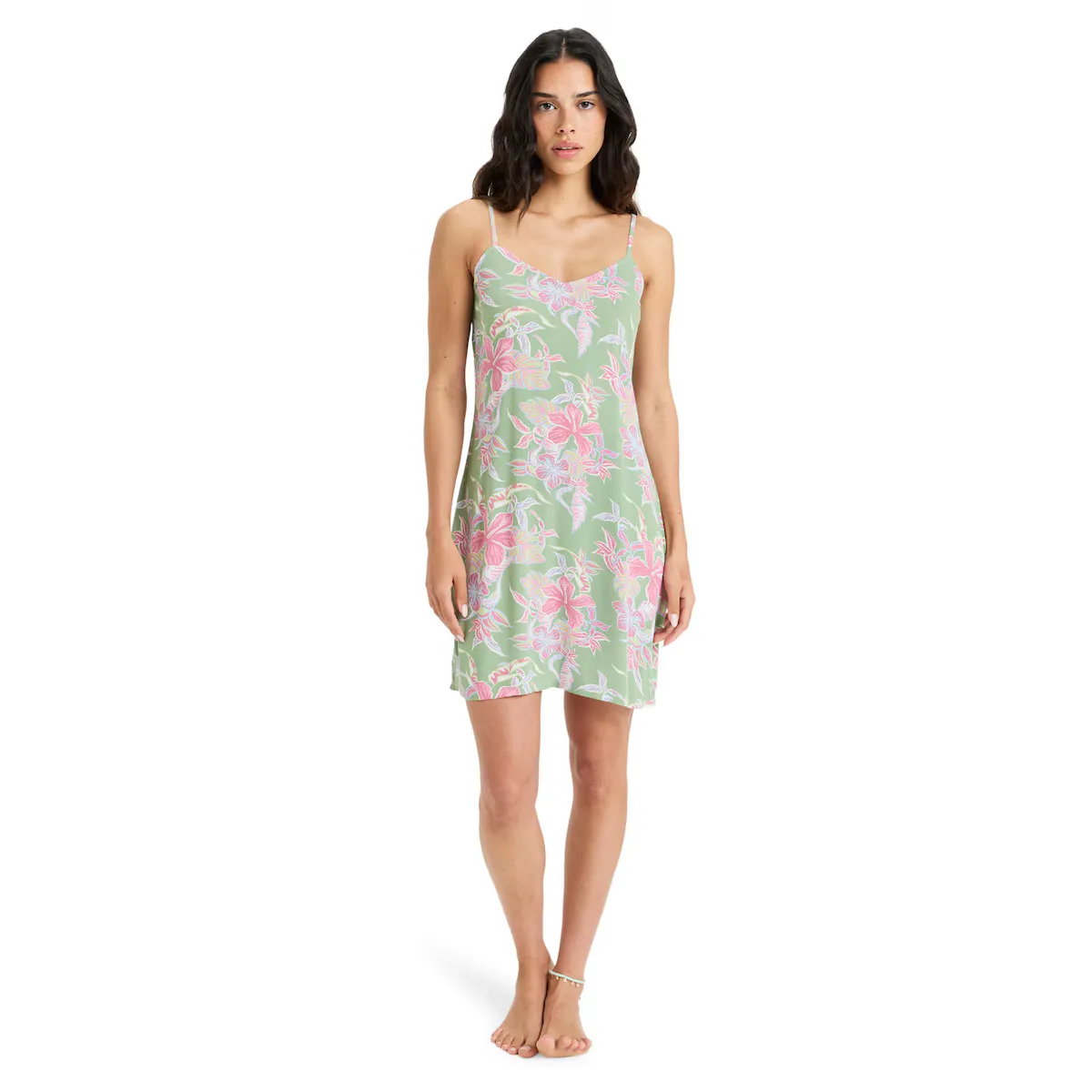 Мини платье для женщин. Особенности включают: Коллекция: Injection Ecom Collection, Ткань: Эко ткань из вискозы креп в стиле Moss (152 г/м2), Длина: мини, Воротник: Мягкий V-образный вырез, Бретели: Регулируемые тонкие бретели, Бренд: Металлическая пластина Roxy в нижней части переднего края и Другие особенности: Легкая посадка мини-кроя.
