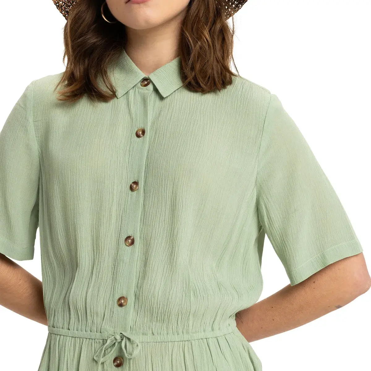 Женский комбинезон. Особенности включают: Ткань: Мятая вискозная ткань [130 г/м2], Крой: свободный крой, Воротник: воротник рубашки, Рукава: короткий рукав, Талия: Эластичная талия, Застежка: Застежка на пуговицы спереди и воротник рубашки, Карманы: боковые передние карманы и Длина: Более короткая длина штанины.