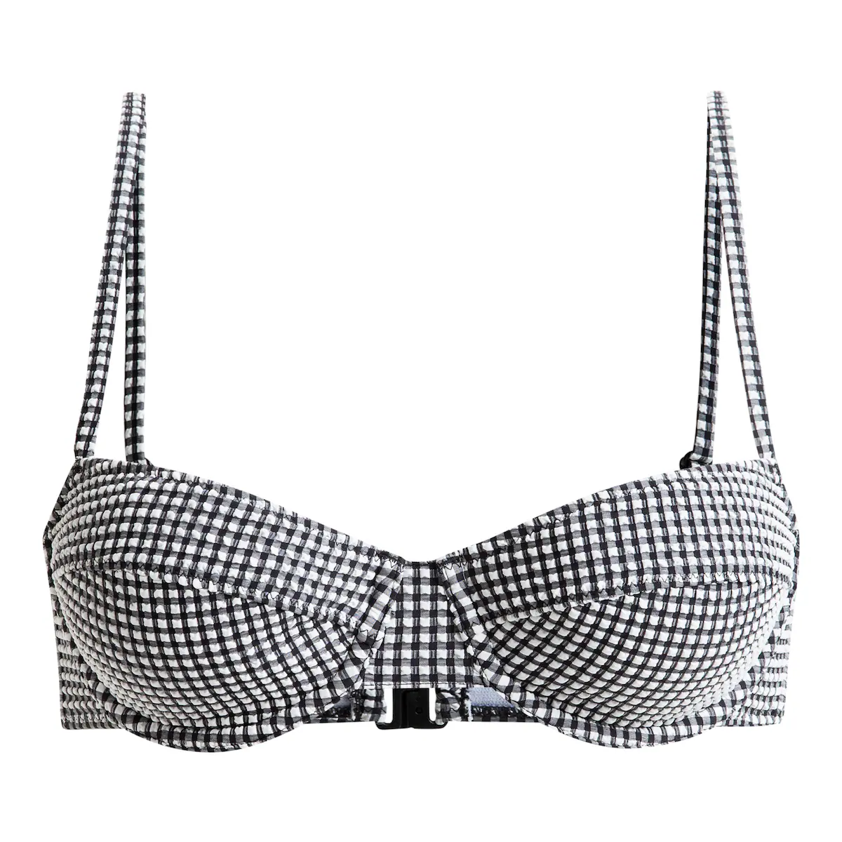Топ бикини среднего покрытия для женщин. Особенности включают: Коллекция: Гингема, Ткань: Эластичная ткань, мягкая и прочная, смесь переработанного полиэстера 62% 33% нейлон 5% эластан с текстурой, Дизайн: на косточках, Воротник: Вырез в виде сердца, Поддержка: высокая поддержка, Наполнитель: мягкий, Бретели: регулируемые бретели с косточками и ползунками, Застежка: застежка-клипса, Покрытие: среднее покрытие и Бренд: резиновая пластина ROXY.