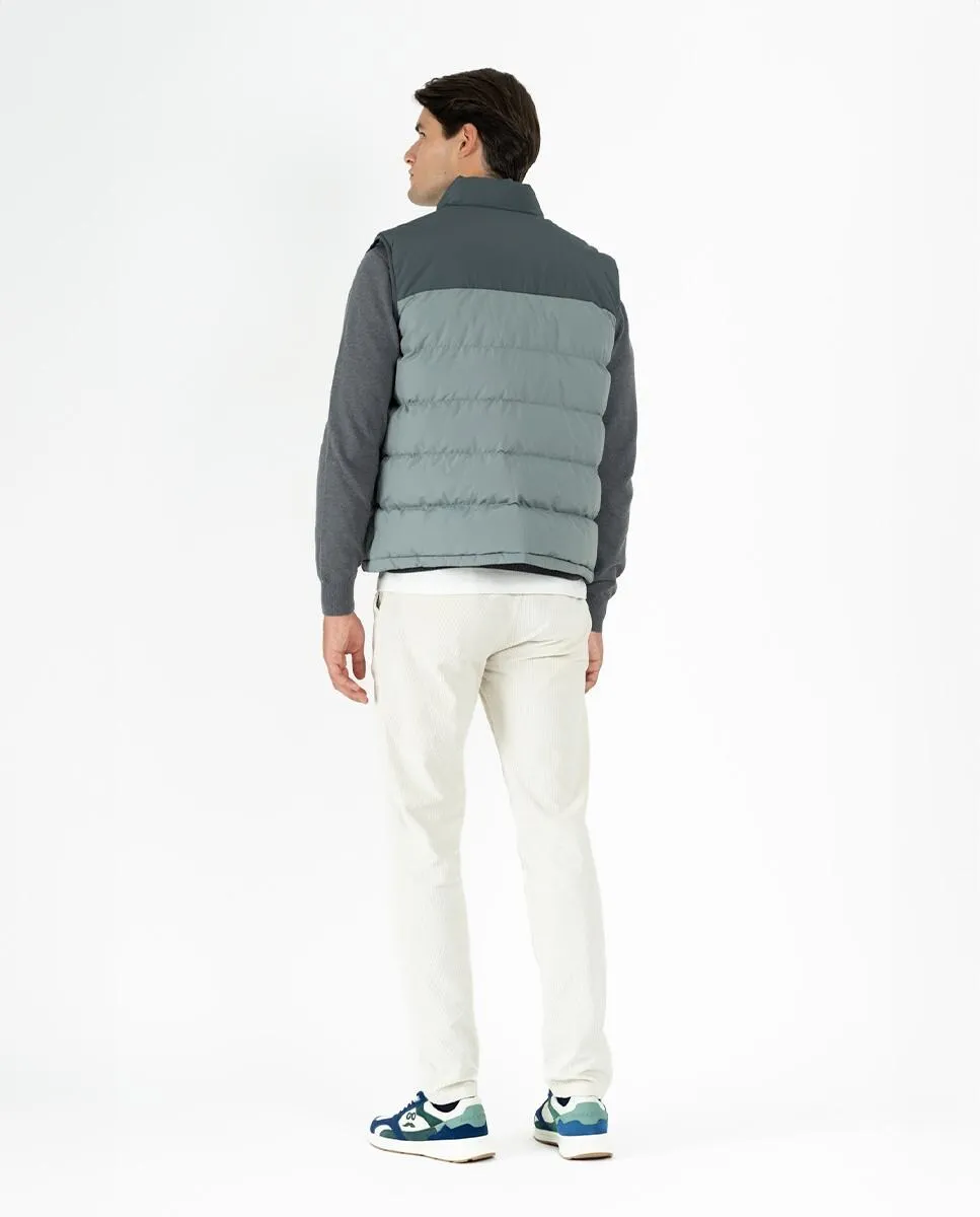 Ультралегкий жилет, приталенного кроя. Двухцветный дизайн с вырезом на груди. Боковые карманы по швам. Застежка-молния. Нашивка с логотипом ПВХ спереди. 100% полиэстер.