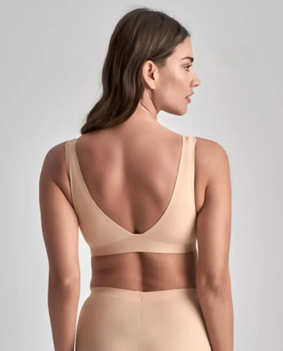 Топовый бюстгальтер с глубоким вырезом и V-образной формы не имеет швов, незаметен под одеждой и является идеальной заменой традиционному бюстгальтеру. Он имеет хорошую поддержку и очень удобен.