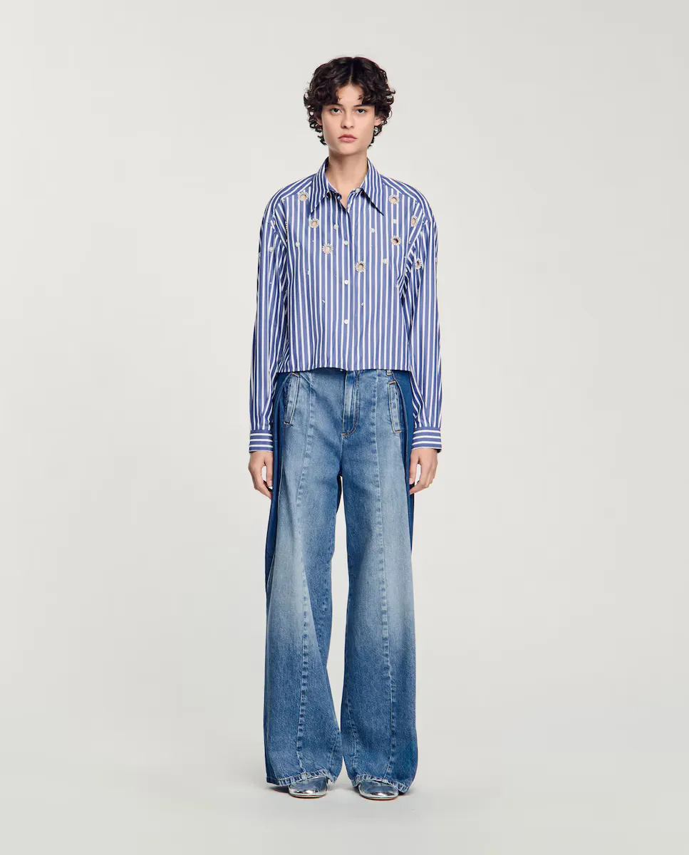 Рубашка в полоску с классическим воротником, длинными рукавами с манжетами на пуговицах, планкой на пуговицах и круглой деталью со стразами и стразами. Женская полосатая рубашка из хлопка Sandro. Ажурные круги со стразами и стразами. Классический воротник. Длинные рукава с манжетами на пуговицах. Закругленный подол. Планка на пуговицах.