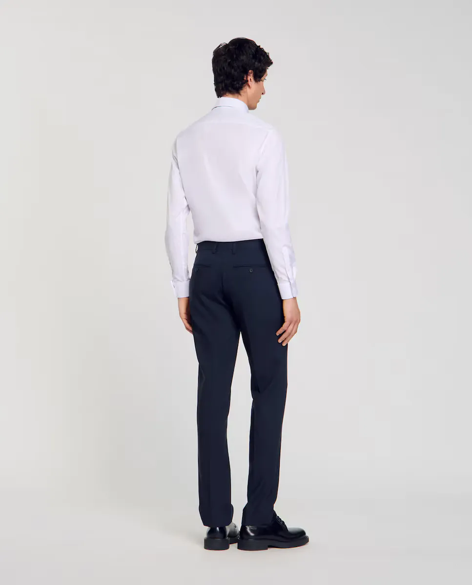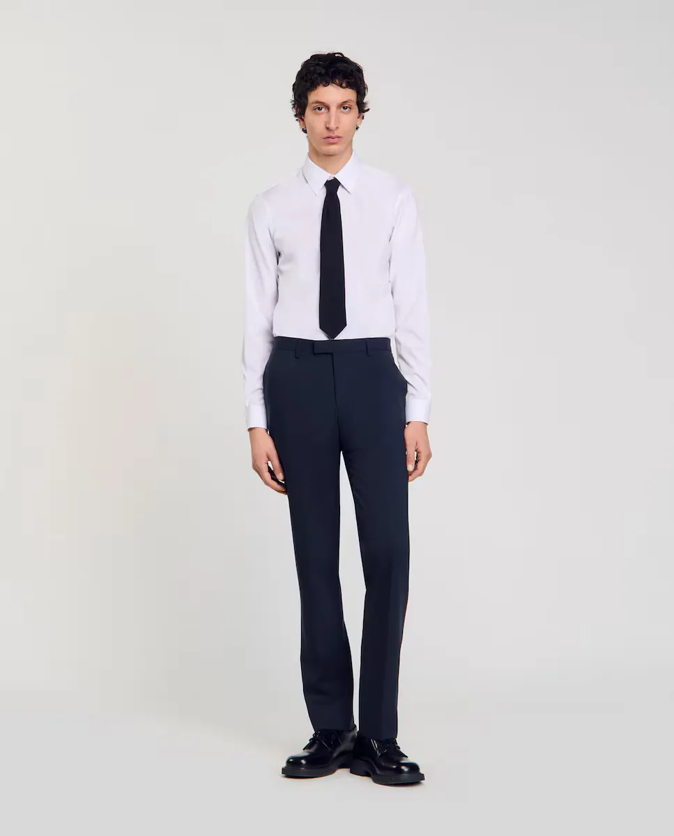 Шерстяные костюмные брюки классического кроя, карманами и застежкой-молнией на крючок. Sandro Мужские шерстяные костюмные брюки. Классический крой. 2 кармана. Прорезные карманы сзади. Матчевая куртка