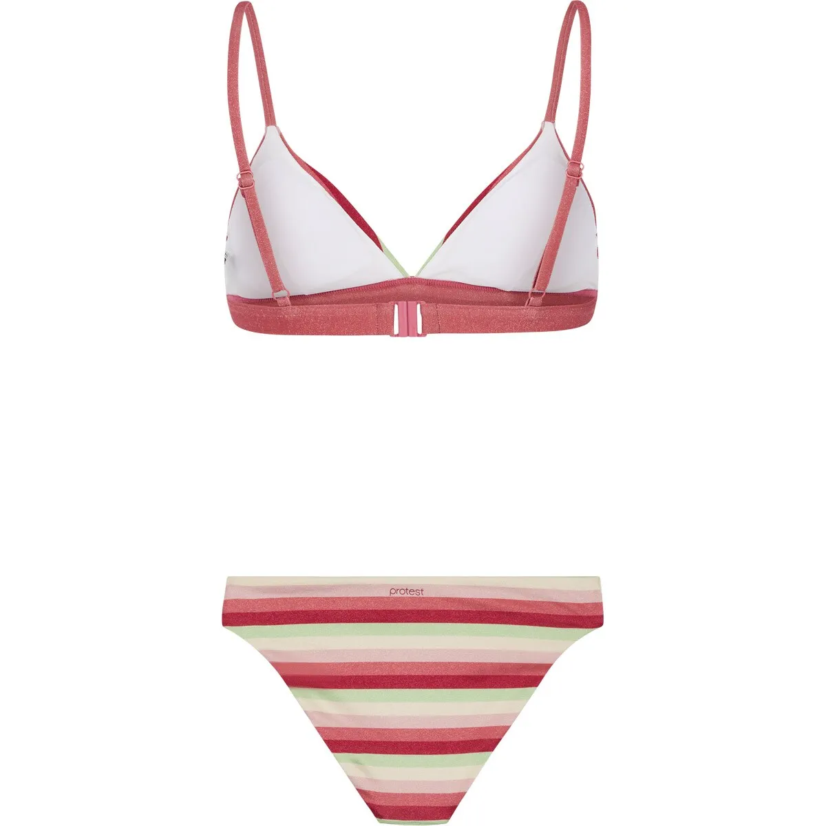 Сделайте ставку на фактор неожиданности этим летом с PRTRAYA от Protest. Этот комплект бикини включает в себя треугольный верх бикини и подходящие низы. На ткани нанесен принт с ярким полосатым рисунком; Перевернутый V-образный узор на чашках создает привлекательный эффект! Верхняя часть имеет съемные быстросохнущие чашки для дополнительной поддержки и комфорта. Трусики имеют правильный крой и талию. PRTRAYA также является частью нашего обязательства делать вещи более экологичным способом; в производственном процессе не используются перфторуглероды.