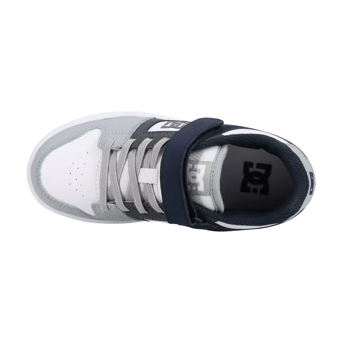 Кроссовки для детей. Особенности включают в себя: верх из кожи, нубука, замши или сетки, язычок и воротник с подкладкой из пеноматериала для комфорта и поддержки, клейкая застежка из ленты, эластичные шнурки, внутренняя сетчатая ткань, повышенный комфорт, обхватывающий интерьер из EVA, устойчивая к истиранию цепкая резиновая подошва и фирменный узор DC Pill Pattern.