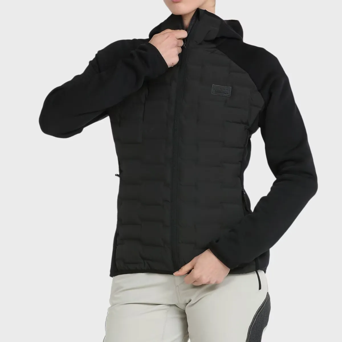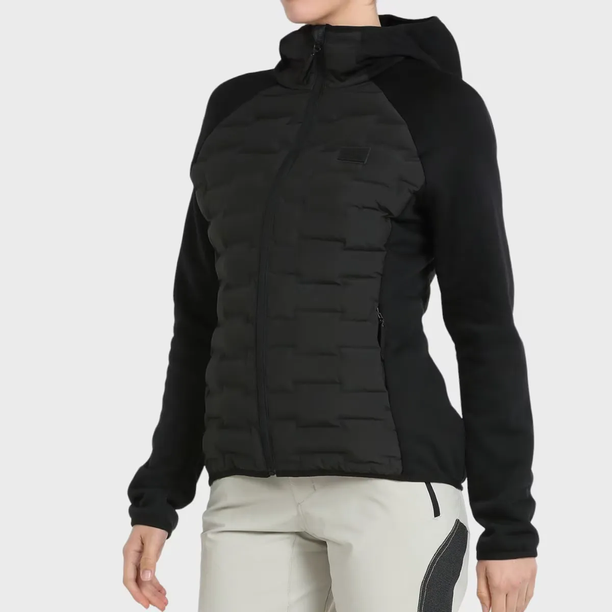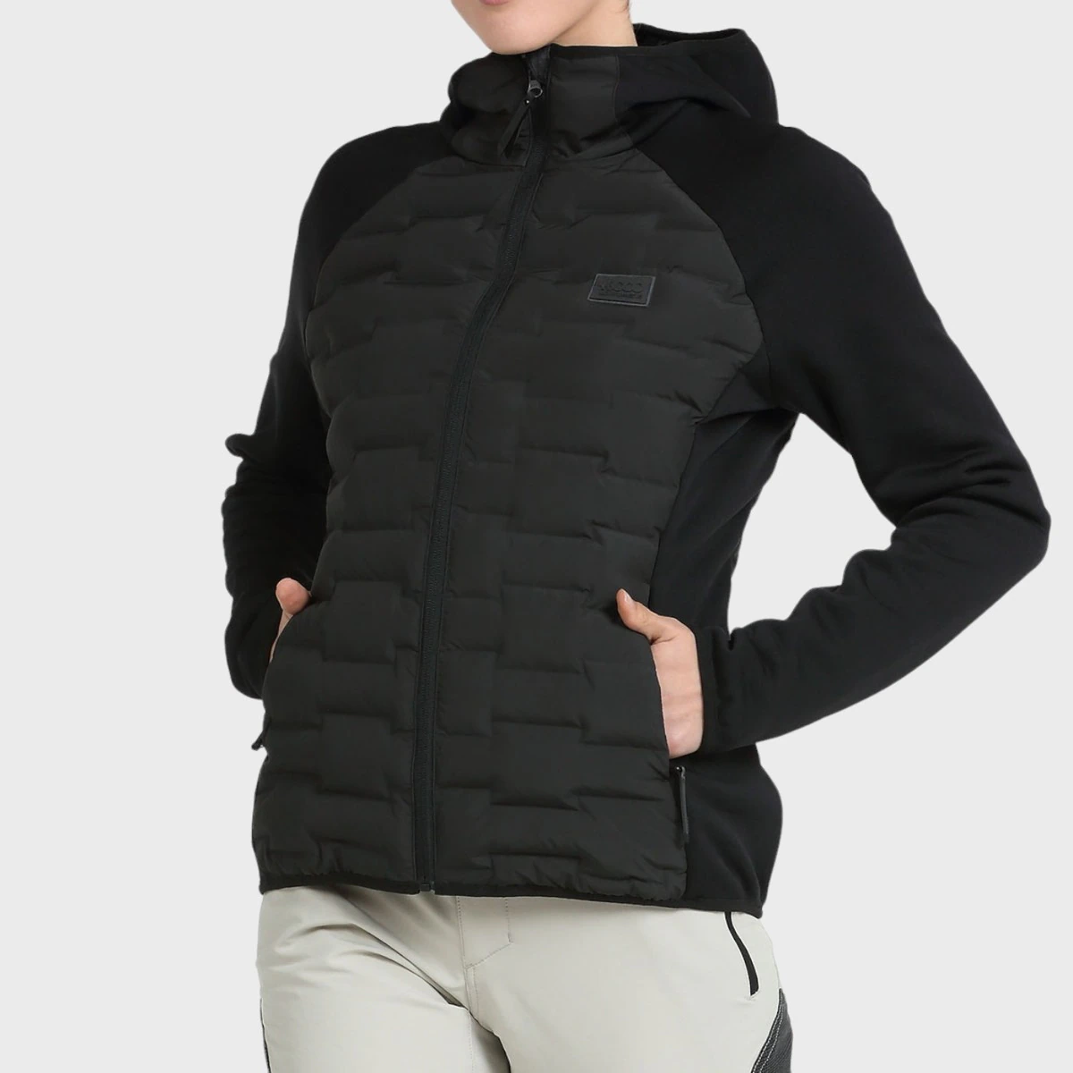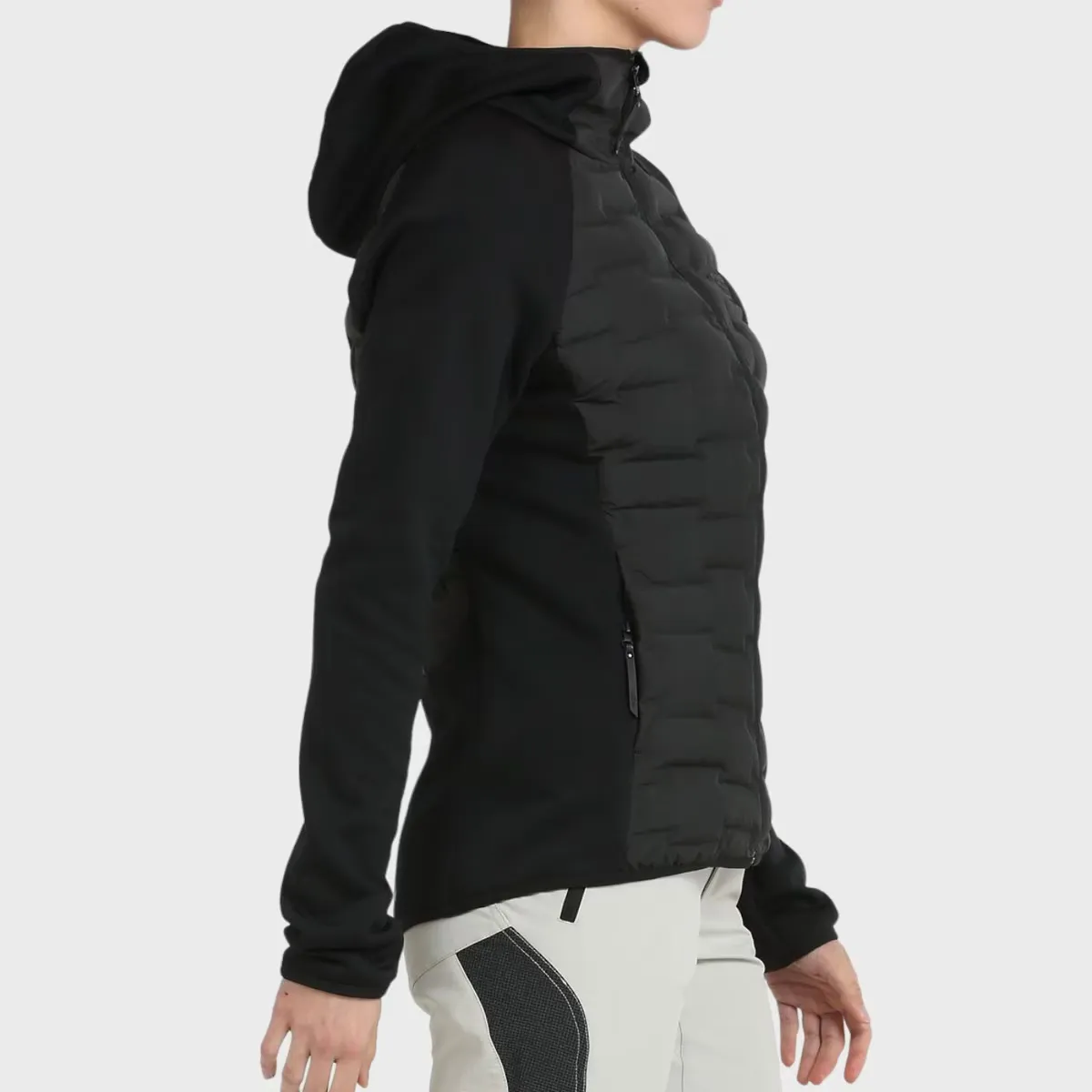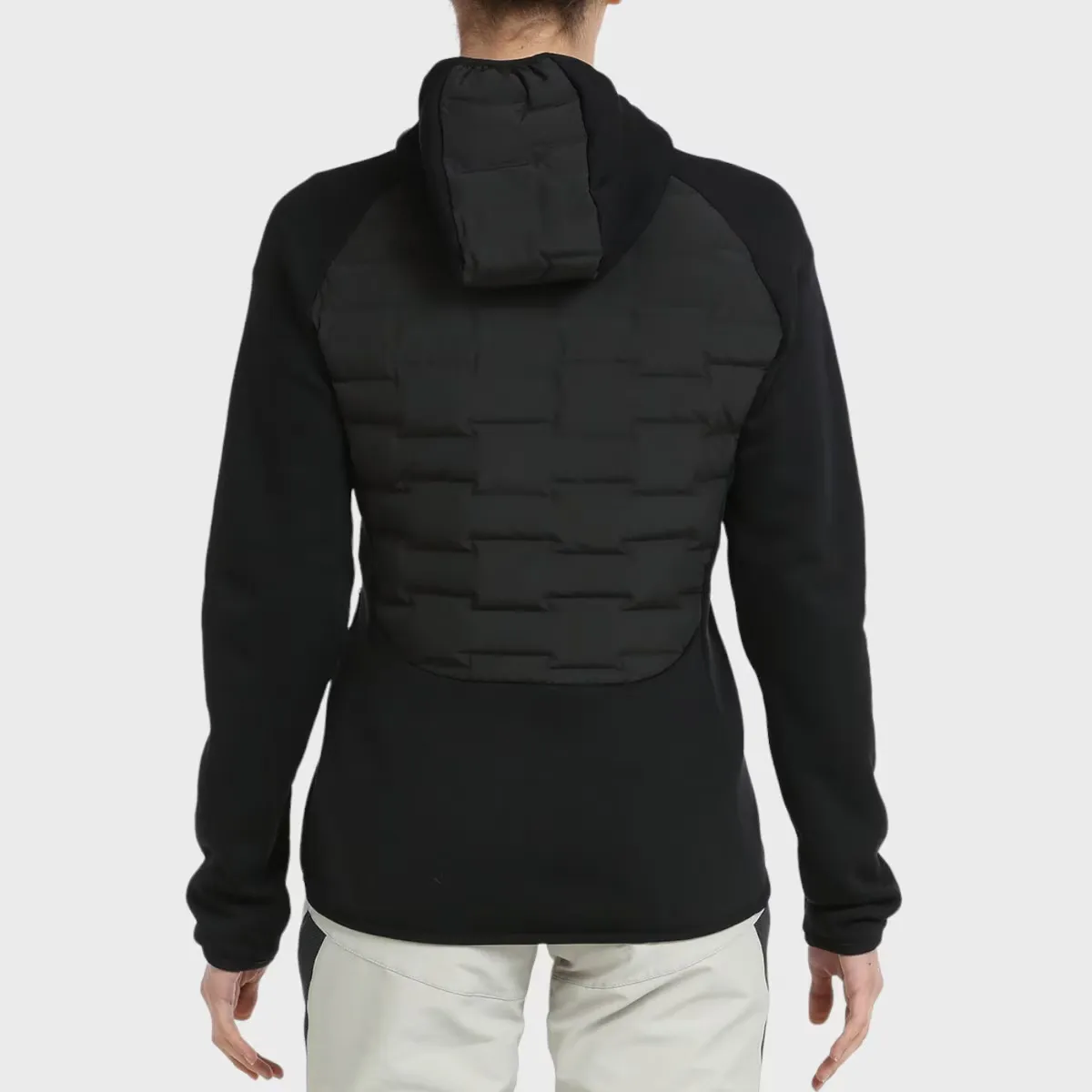 Гибридный анорак со спинкой и спереди из 3D ткани; Характерной особенностью данной ткани является конструкция камер, для размещения которых размещается наполнитель, без швов, что повышает устойчивость изделия к воде и ветру. Внешняя ткань из полиэфирной тафты с отделкой DWR и наполнителем SORONA AURA от Dupont. Рукава и бока изготовлены из полиэфирной ткани с 5% эластана, очень эластичной и с полярной отделкой внутри. Боковые карманы на молнии, капюшон, манжеты и низ собраны эластичной окантовкой