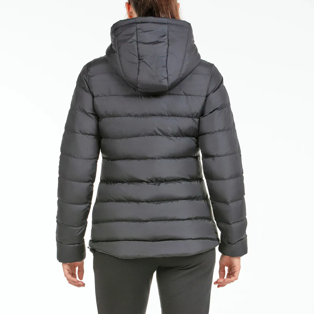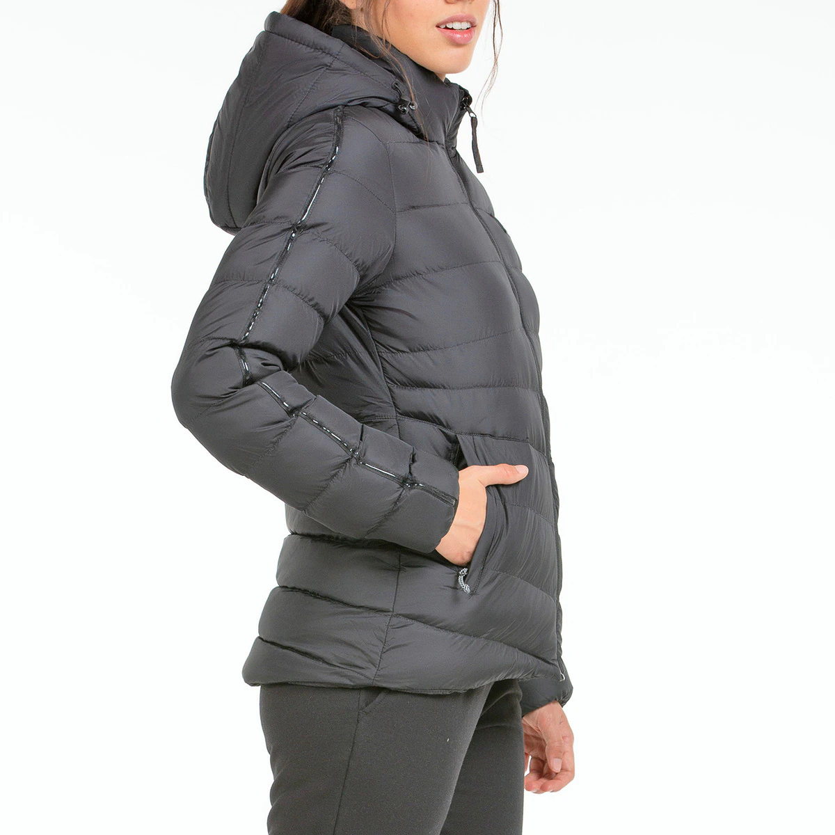 Женский пуховик, с наполнителем из полиэстера, разделенный на черные пудинги и боковые карманы на молнии. декоративная этикетка на груди и лента с деталями из гелевых чернил на рукавах. Манжеты внизу и капюшон для регулировки.