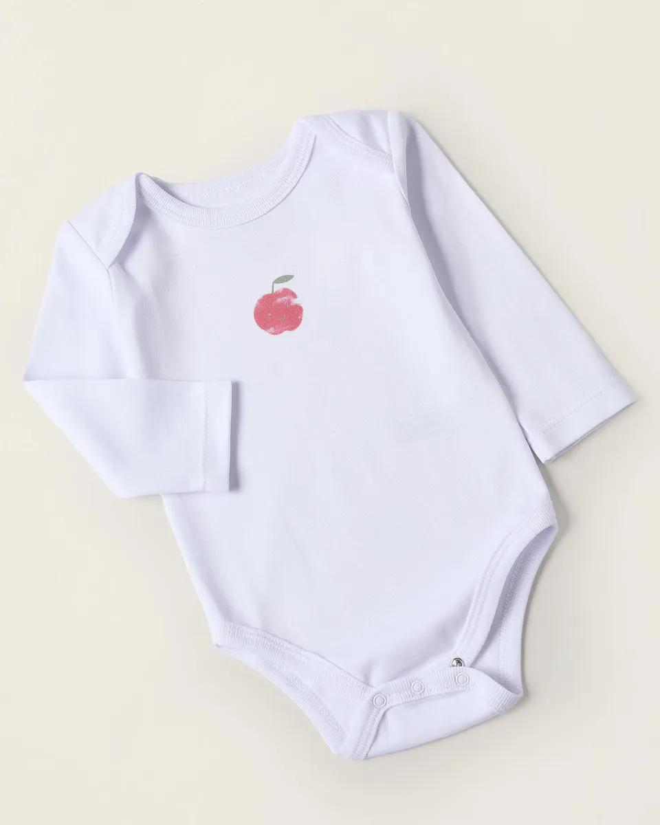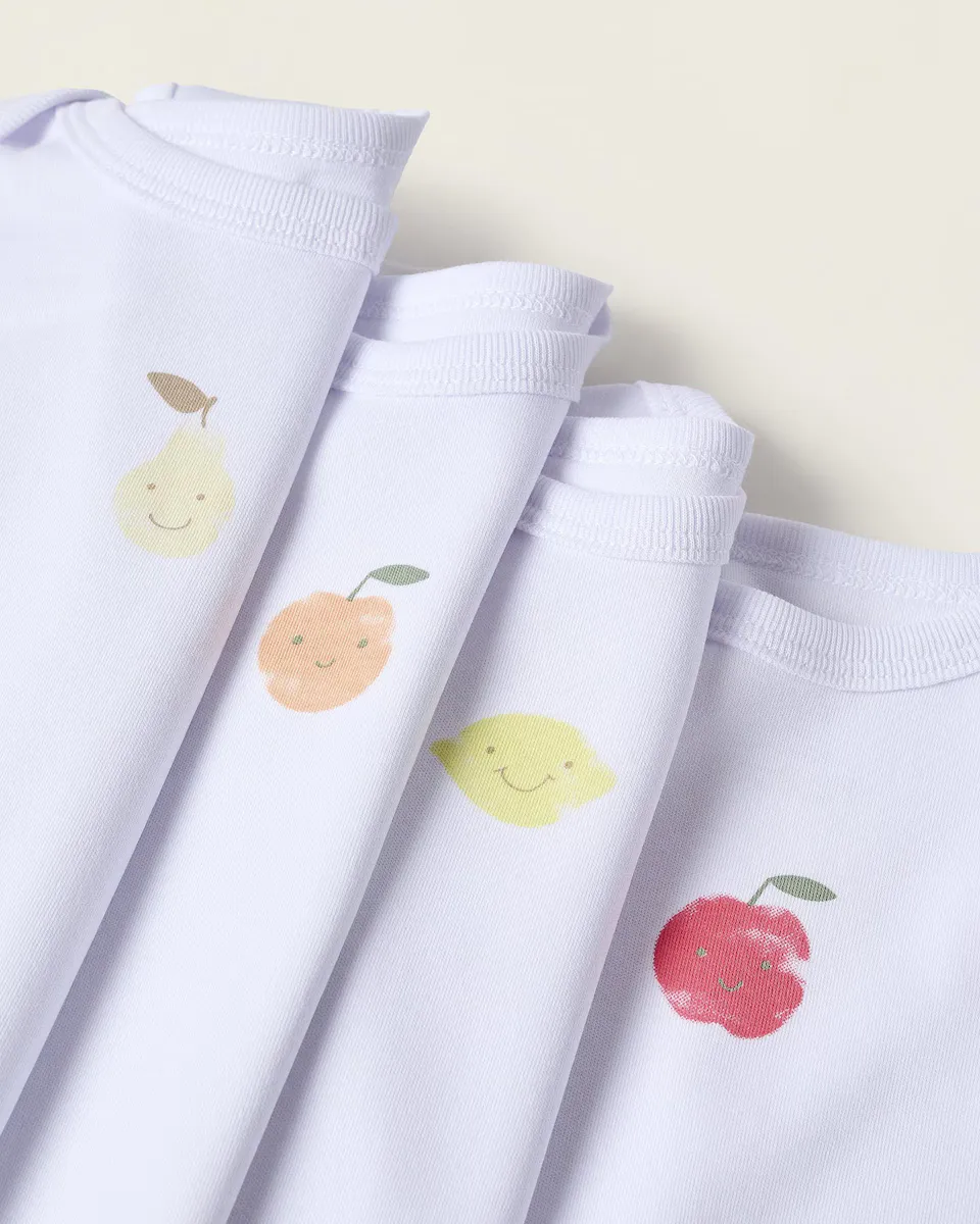 Набор из четырех белых боди с длинными рукавами для новорожденных и младенцев, 100% хлопок. С фронтальным принтом разных фруктов. Перекрестные плечи для удобства одевания. Напечатанная внутренняя этикетка, чтобы не раздражать кожу. Для обеспечения ежедневного комфорта.