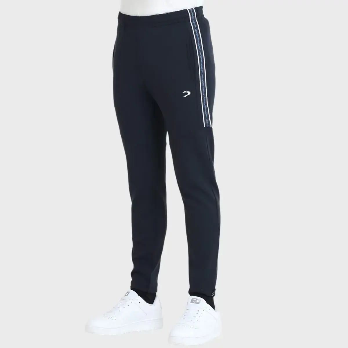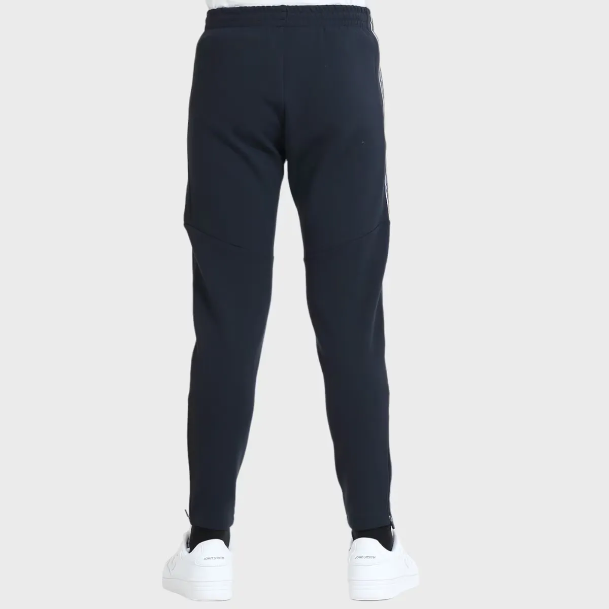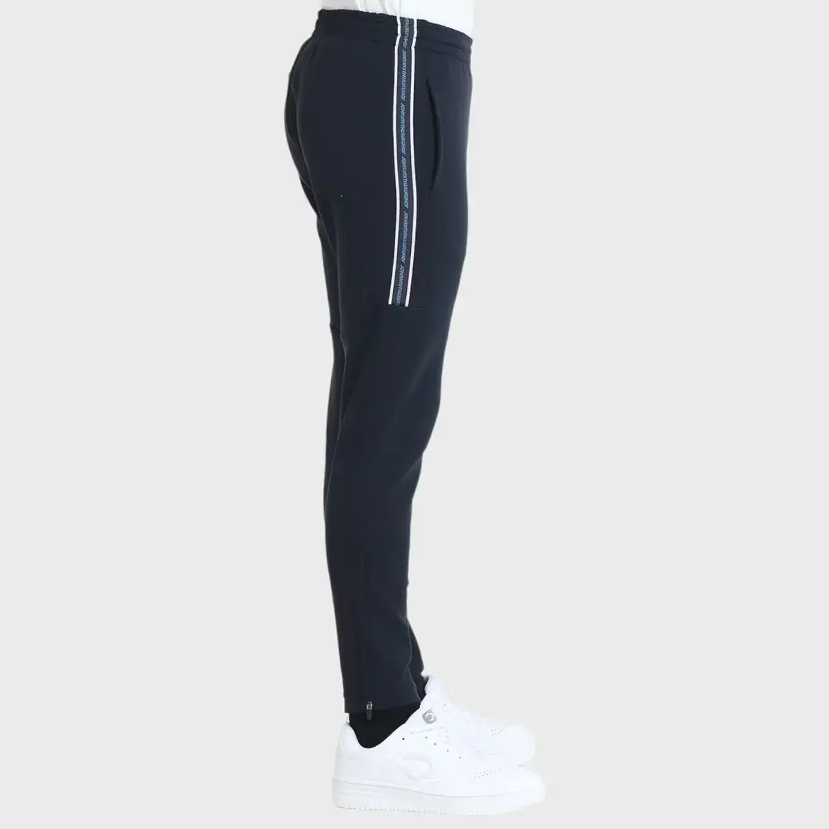 Длинные брюки с регулируемым подолом, боковыми карманами на молнии, именными накладками, ремешком на подоле и примерным логотипом на ноге.