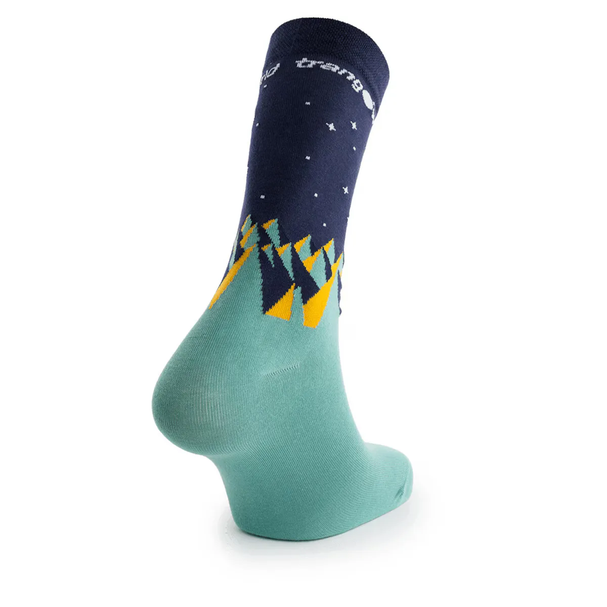 Забавный носок до середины икры с альпинистскими мотивами. Сочетает в себе хлопок и пряжу PROLEN.