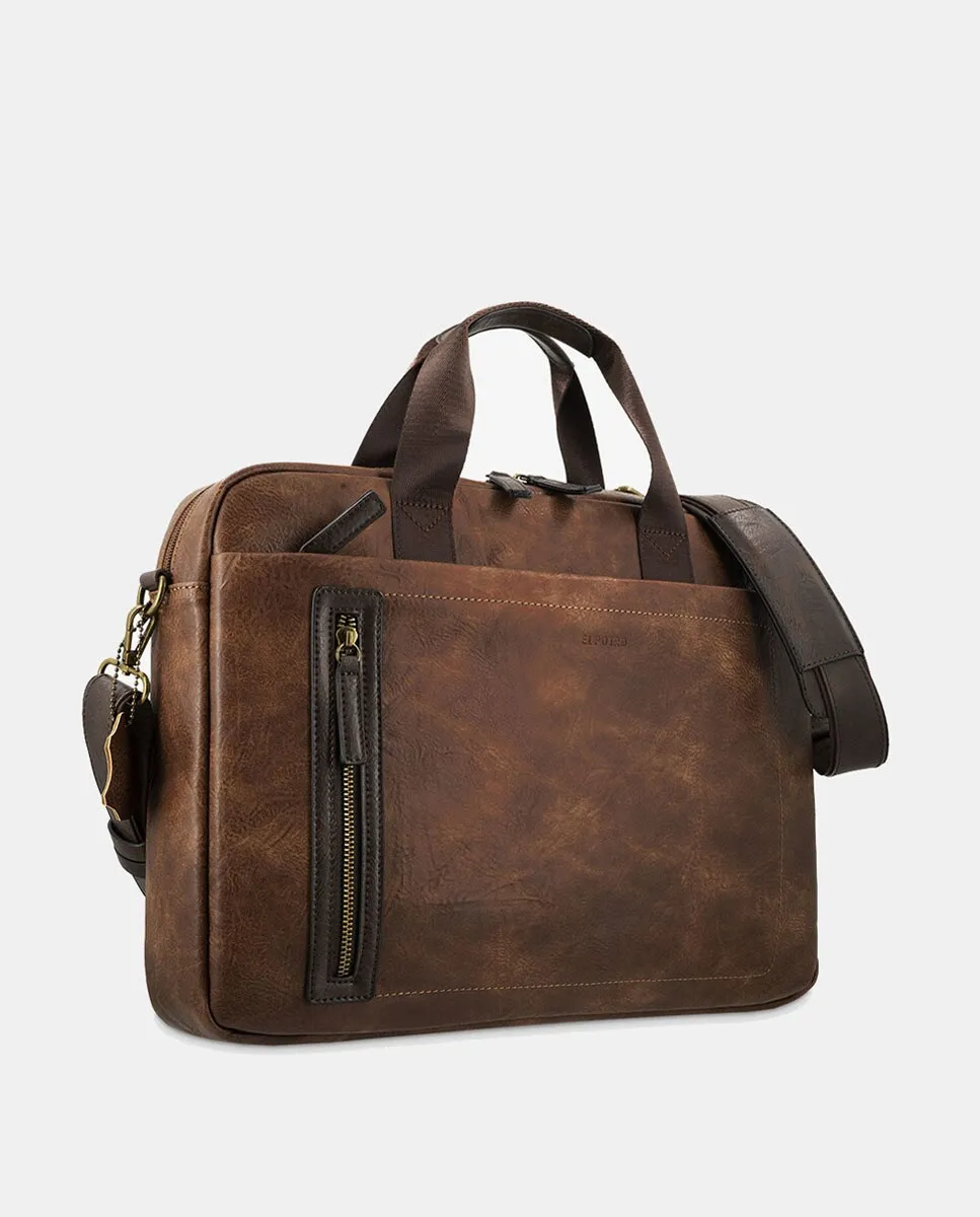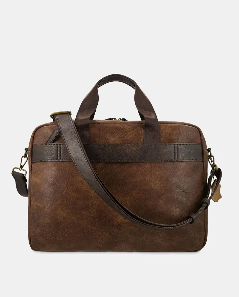 Портфель, папка для документов и компьютера из холста. Имеет несколько отделений, закрывающихся на молнию, с передним карманом на молнии. Он имеет ручку и выдвижную ручку для подвешивания. В салоне есть карман на молнии и отделения для ноутбука, документов и рабочих предметов.