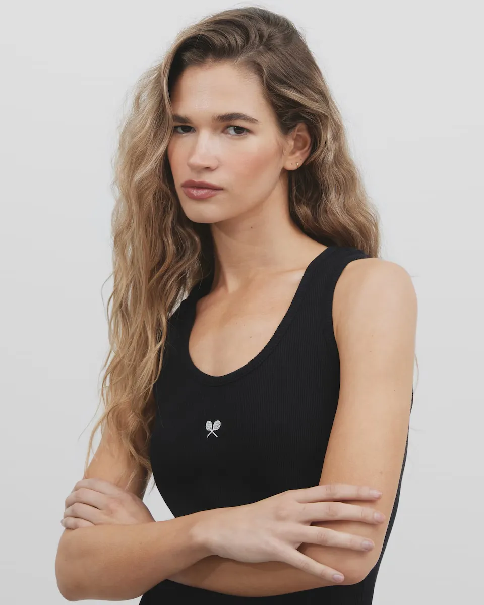 Футболка из 100% хлопка с приталенным кроем. Он украшен черными ребристыми ремнями в майке с контрастной вышивкой логотипа ракетки в стиле ретро белого цвета. Сделано в Португалии.