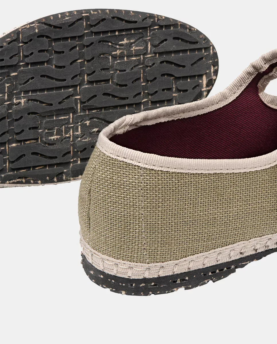 Светло-зеленый лен Mary Jane с бежевой отделкой и застежкой на пряжке.