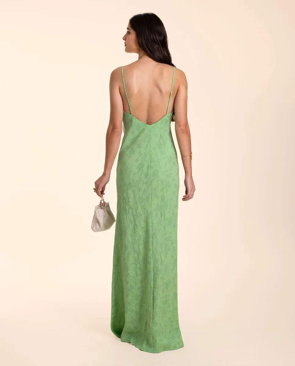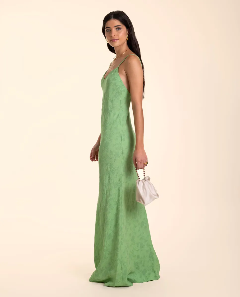Жаккардовое платье на бретелях. Простота, универсальность и элегантность, идеально подходит для ношения в особых случаях. Это платье-комбинация, которое стилизует силуэт и сопровождается очень лестным вырезом, с которым можно носить бюстгальтер. Он скроен по косой, поэтому идеально подстраивается под ваш силуэт.
