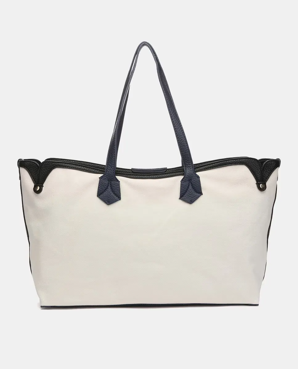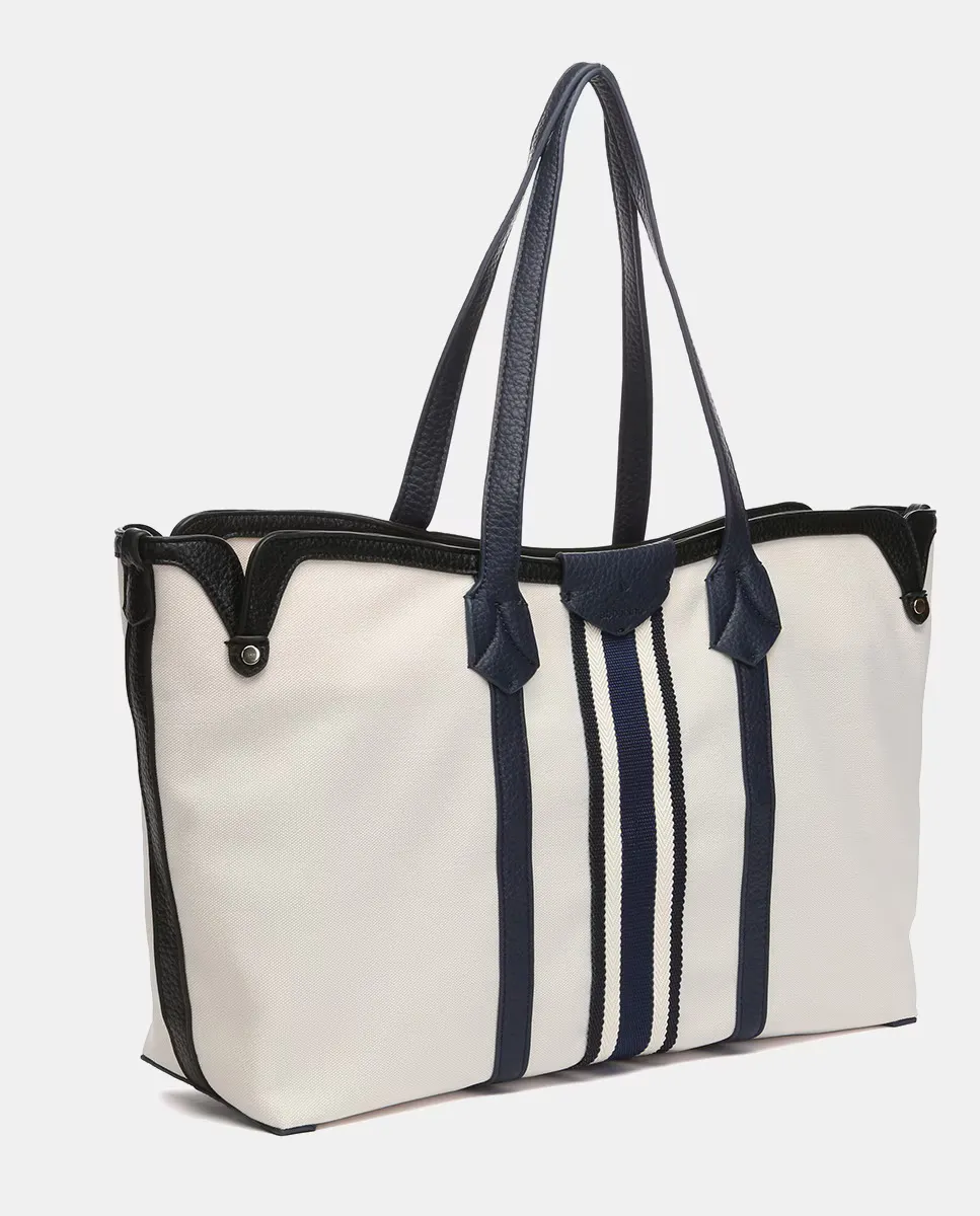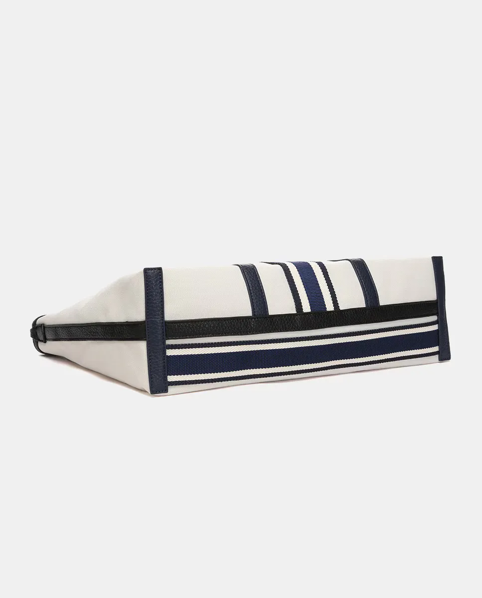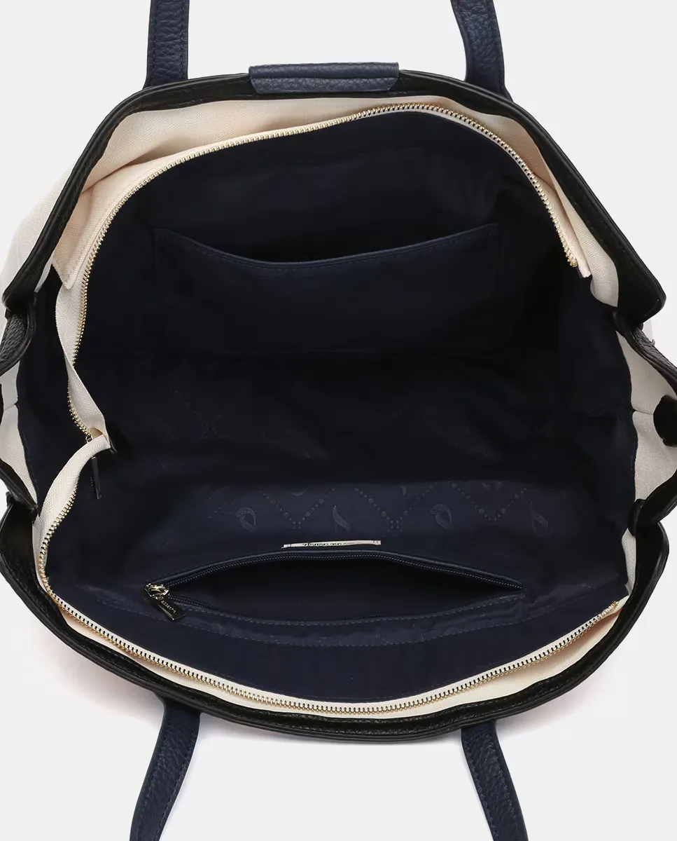 Женская сумка-шоппер изготовлена из переработанных тканей. Плавный и легкий дизайн с явным средиземноморским влиянием и подчеркнутым темно-синим стилем. Повседневный по стилю, он станет идеальным компаньоном для весенних и летних дней. Его интерьер просторный и имеет прочное основание. Магнитная верхняя застежка, на которой мы видим выгравированный логотип бренда.