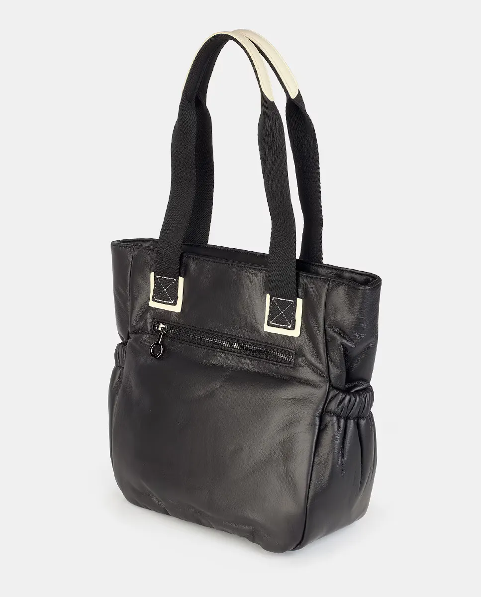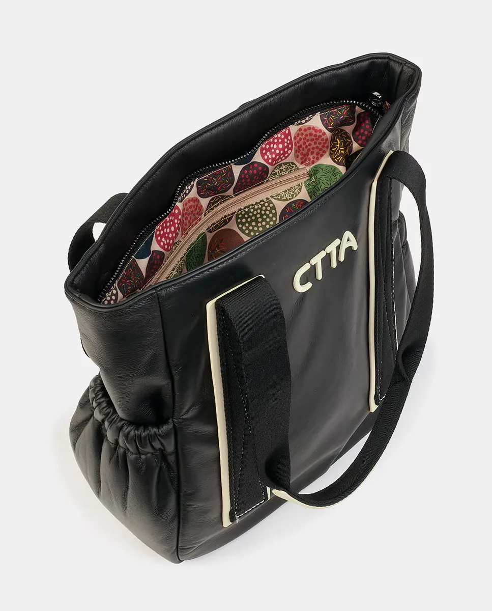 Шоппинг в полиуретане лимонного цвета. Задний и внутренний карман на молнии. Две длинные ручки и длинный съемный регулируемый плечевой ремень с карабином