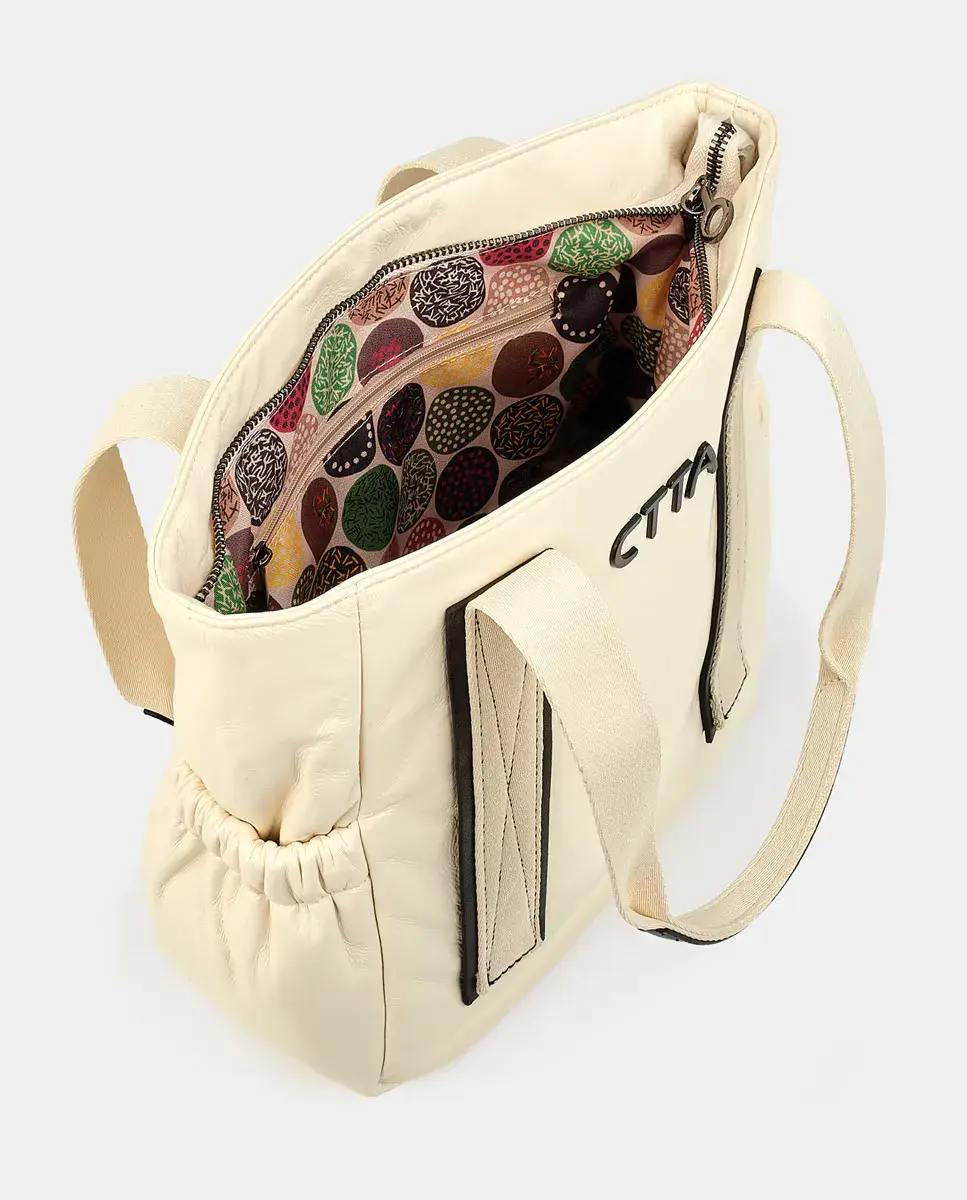Шоппинг в полиуретане лимонного цвета. Задний и внутренний карман на молнии. Две длинные ручки и длинный съемный регулируемый плечевой ремень с карабином