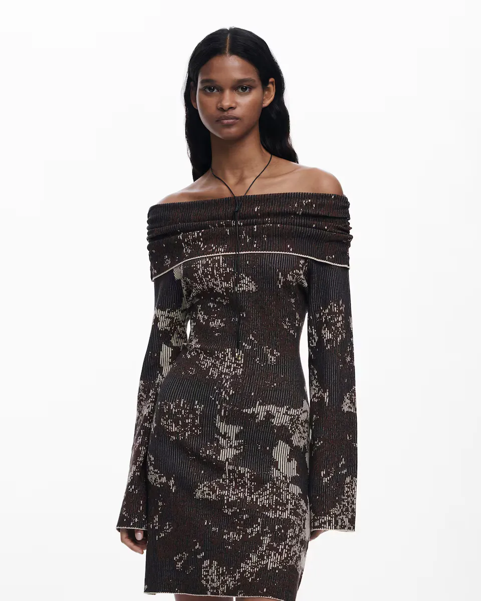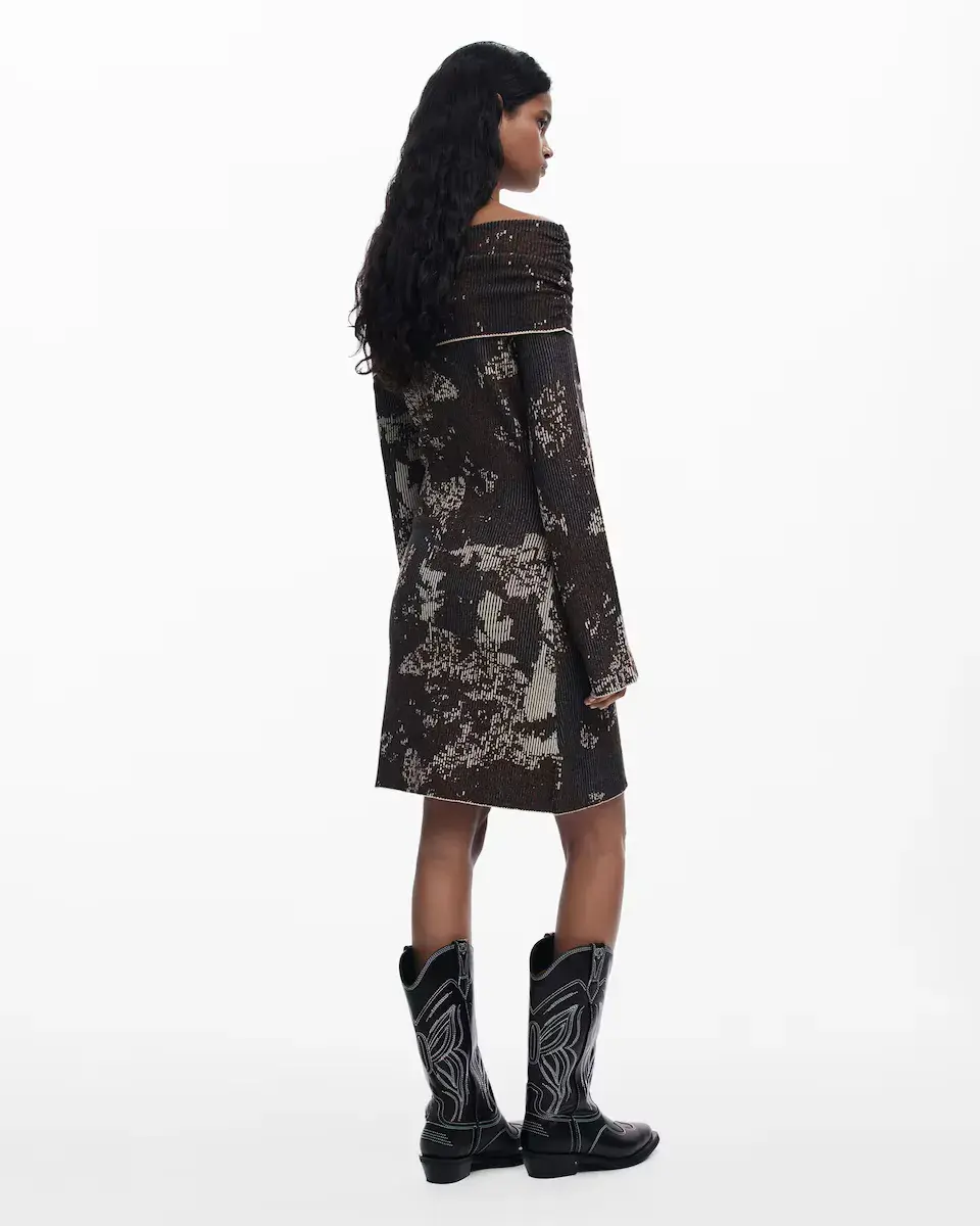 Приталенное мини-платье в рубчик, драпировка сбоку, вырез в стиле бардо и принт Arty. Крой: Стройный. Длина: мини. Воротник: бардо. Рукав: Длинный.