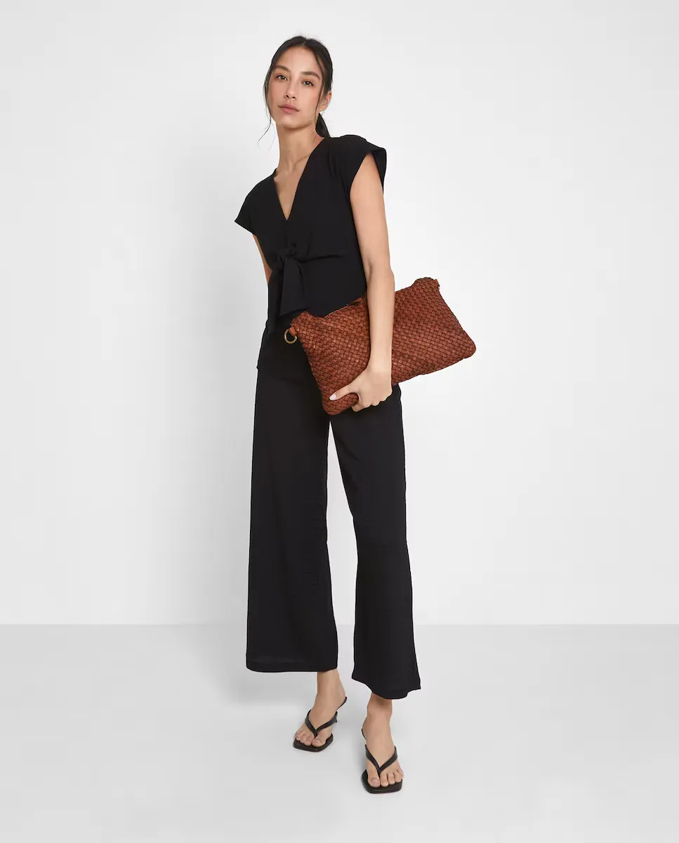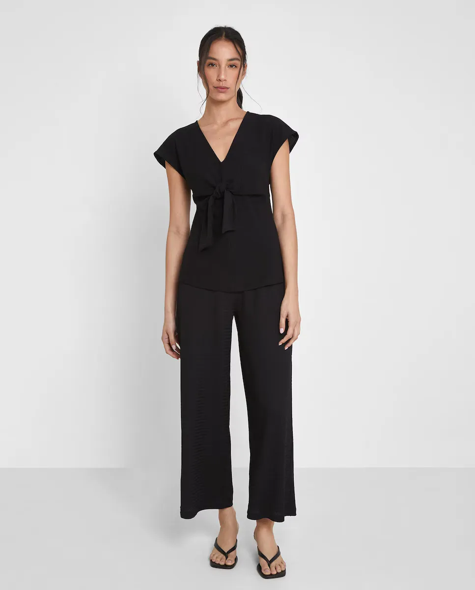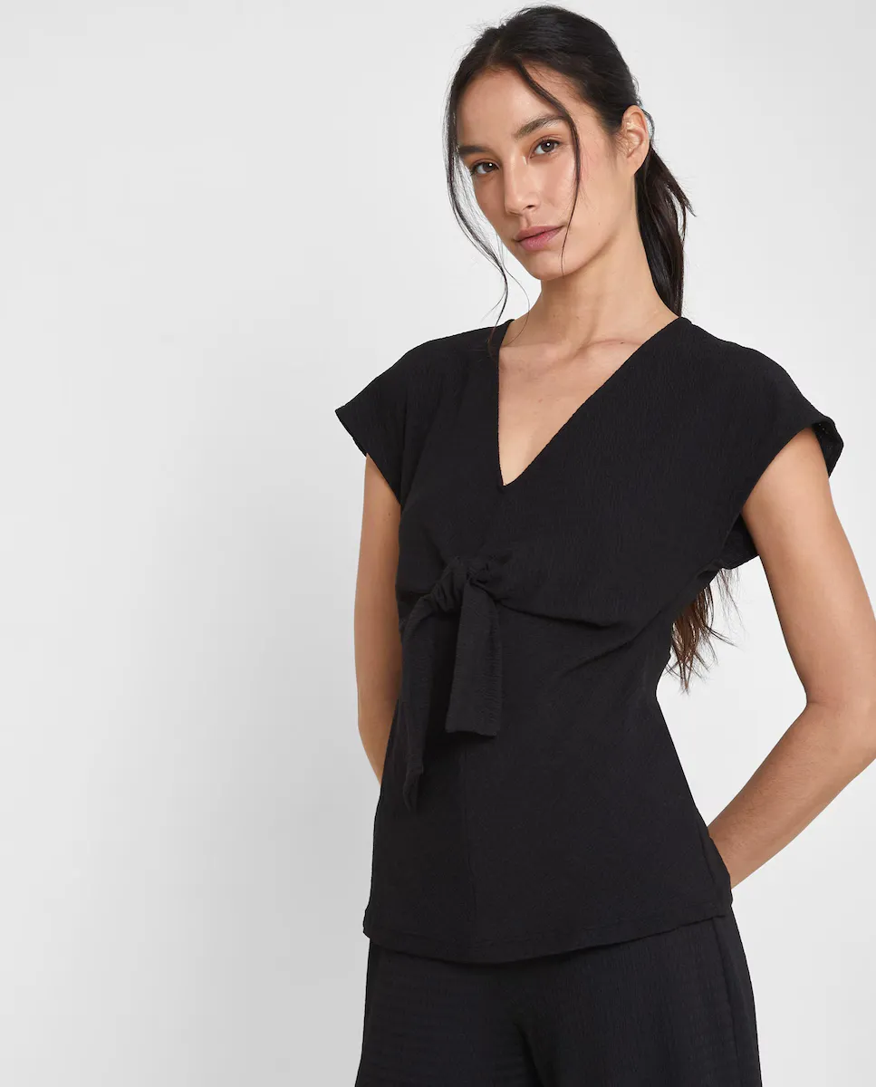 Бесшовная блуза с короткими рукавами с регулируемым спереди бантом и V-образным вырезом.