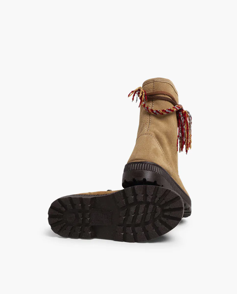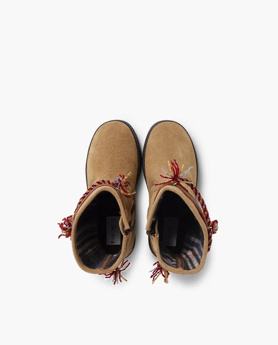 Идеальные сапоги для девочек для молодых и старых, которые можно носить этой зимой, в размерах от 23 до 37. Выполненные из кожи спилка и с тканевой подкладкой внутри, они станут любимцами вашей дочери в этом сезоне. Они поставляются с толстой резиновой подошвой, чтобы выдержать все. Кроме того, у них есть боковая молния, поэтому их легко надевать. Они закрывают стопу выше лодыжки для обеспечения большей поддержки. Эти замшевые сапоги доступны в бежевом или сером цвете. Они окружены шерстяными шнурами разных цветов, достигая очень шикарного стиля хиппи. Они идеально подходят для повседневных образов, в которых вы хотите, чтобы ваша дочь была красивой и комфортной, не отказываясь при этом от своего стиля.