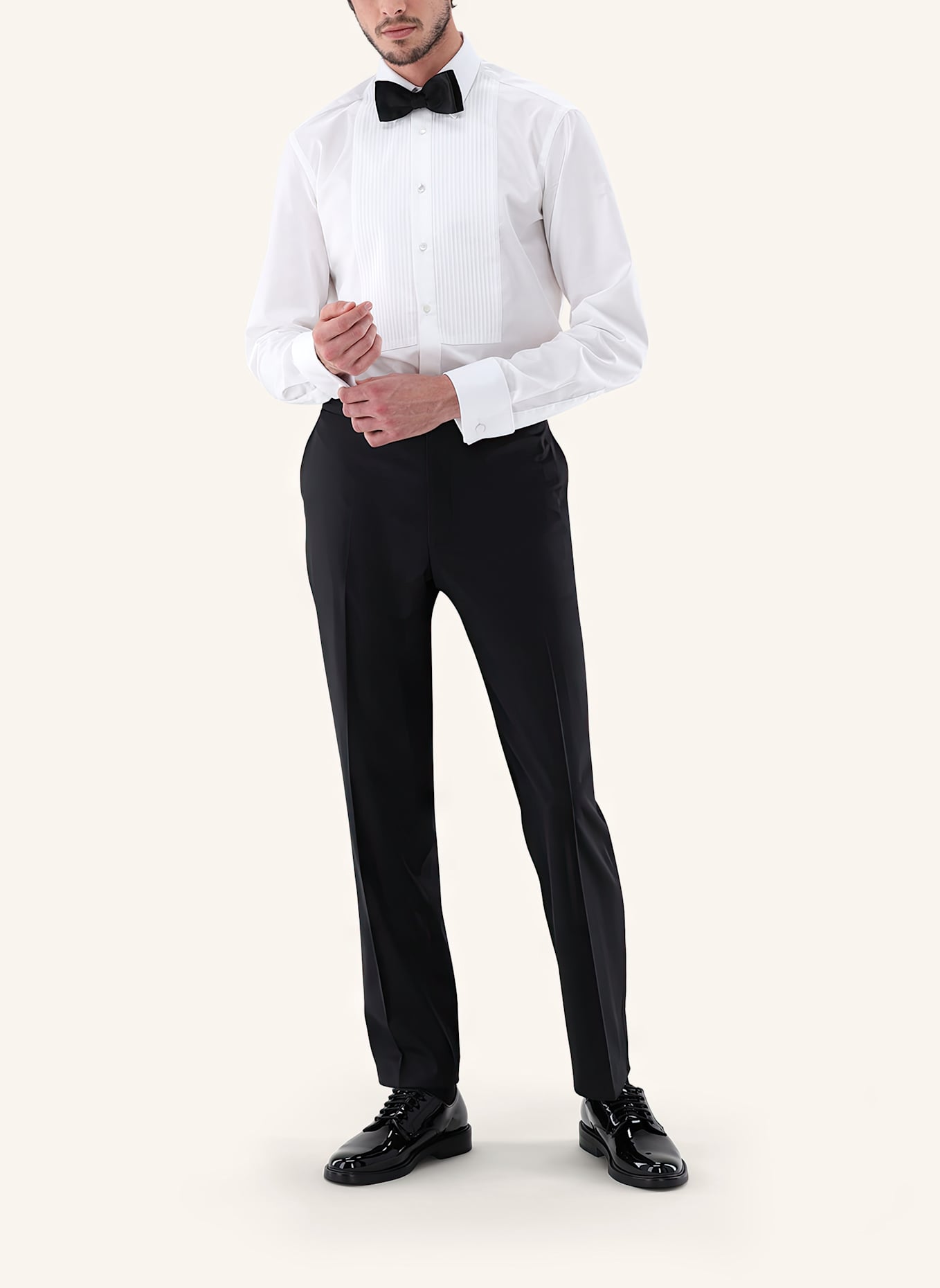 Создан для торжественных мероприятий. Элегантная рубашка-смокинг с плиссированными вставками, которая сделает ваш вечерний образ по-настоящему особенным. Сдержанность, которая сразу бросается в глаза. Рубашка подходит для использования пуговиц смокинга и имеет двойные манжеты.