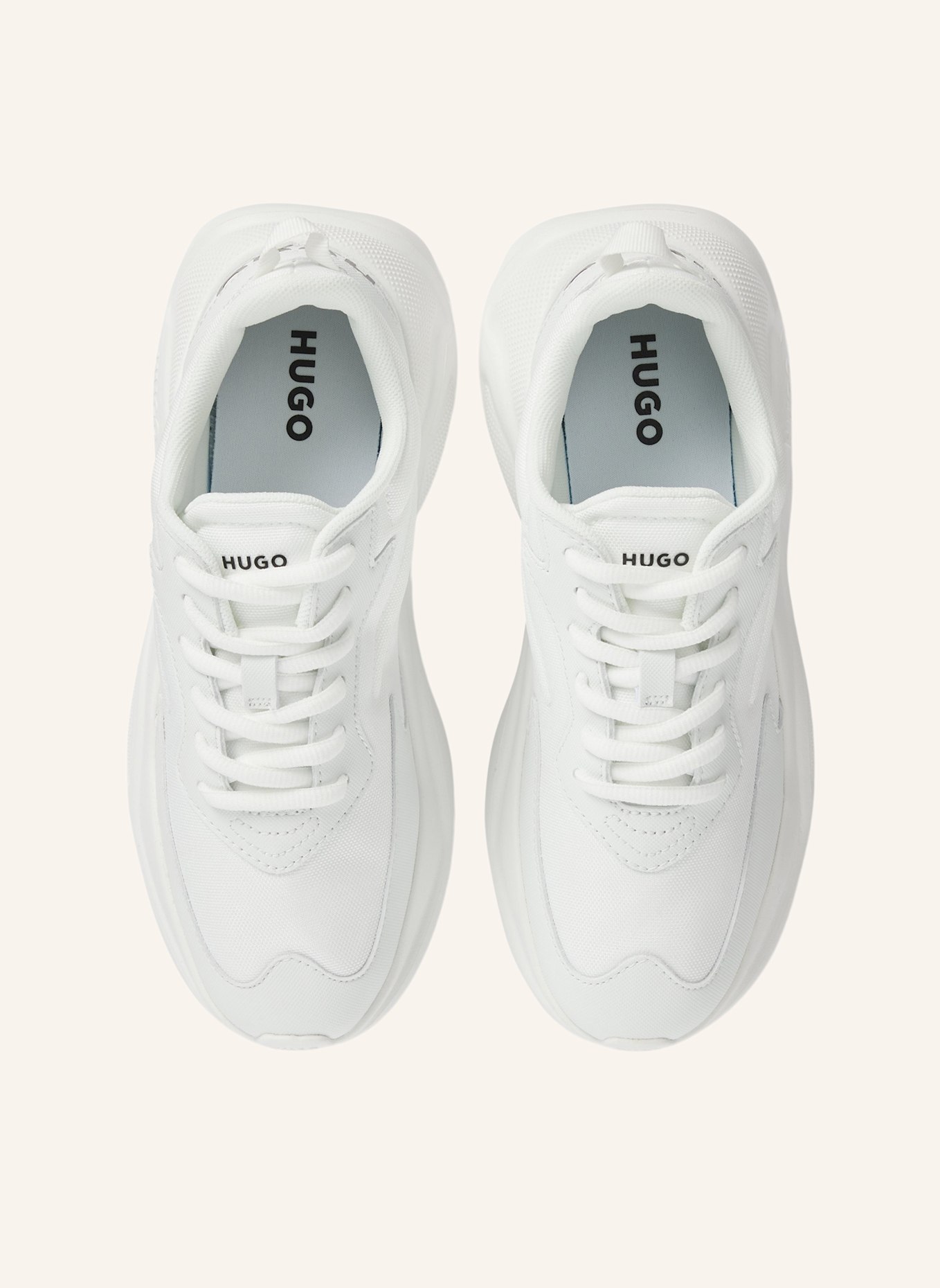 Современные кроссовки HUGO с тональными шнурками и контрастными логотипами. Спортивная обувь изготавливается из различных материалов.