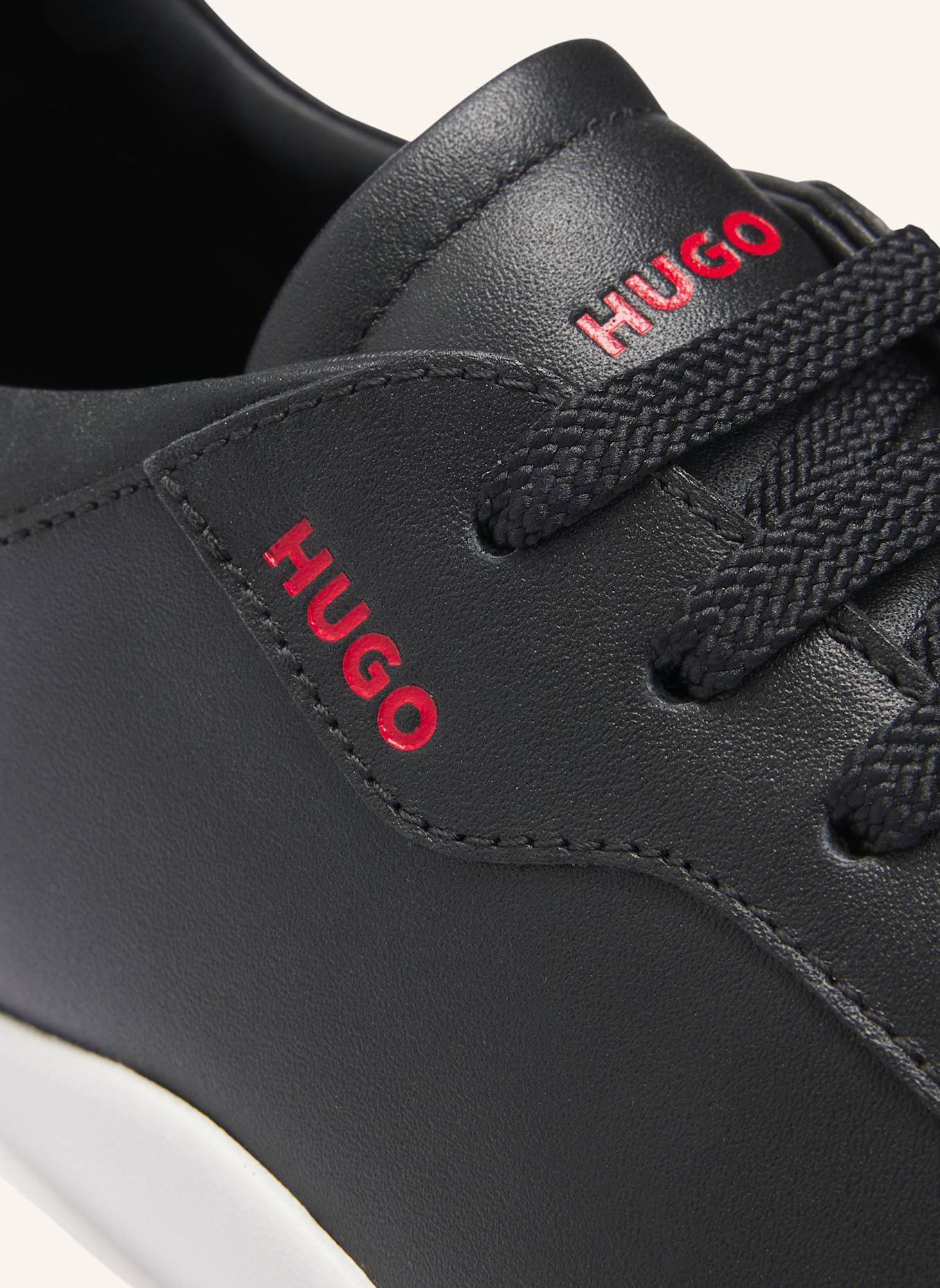 Современные кроссовки HUGO из гладкой кожи с подошвой-чашкой и фирменным красным логотипом сбоку.
