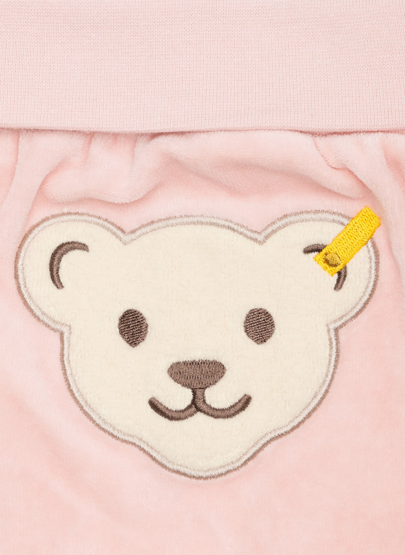 Спортивные брюки из бархатистого органического велюра обеспечивают тепло и создают ощущение уюта. Свободный крой и затягивающийся пояс обеспечивают активным детям полную свободу движений. Низкий шаговый шов и гибкие манжеты на концах штанин создают особенно милый силуэт. Светло-серый цвет можно быстро превратить в стильный образ с помощью узорчатого боди. Благодаря изображению пушистого плюшевого мишки Steiff на спинке небольшие падения во время обучения ходьбе больше не будут такими уж страшными. Брюки изготовлены из органического хлопка.