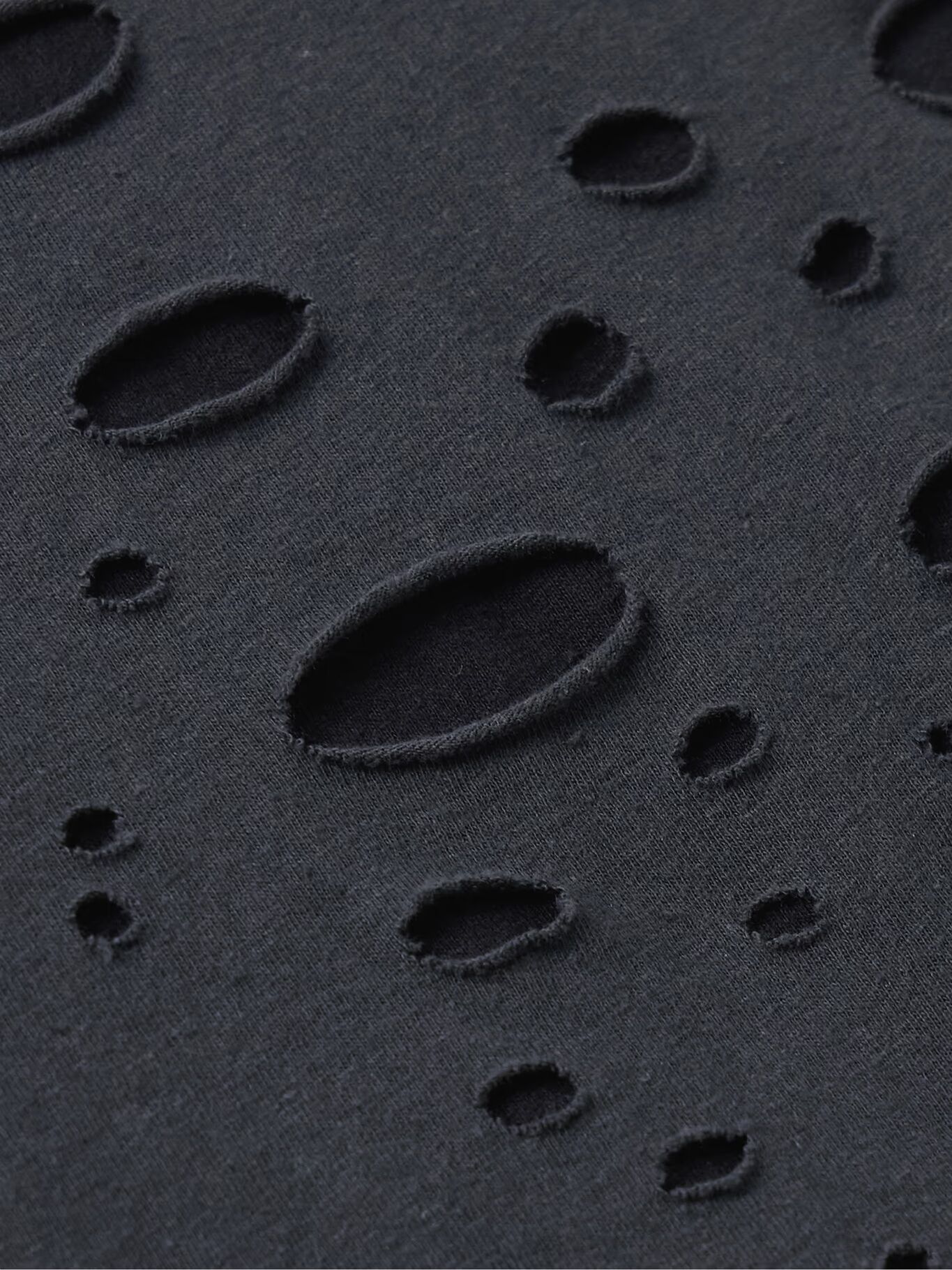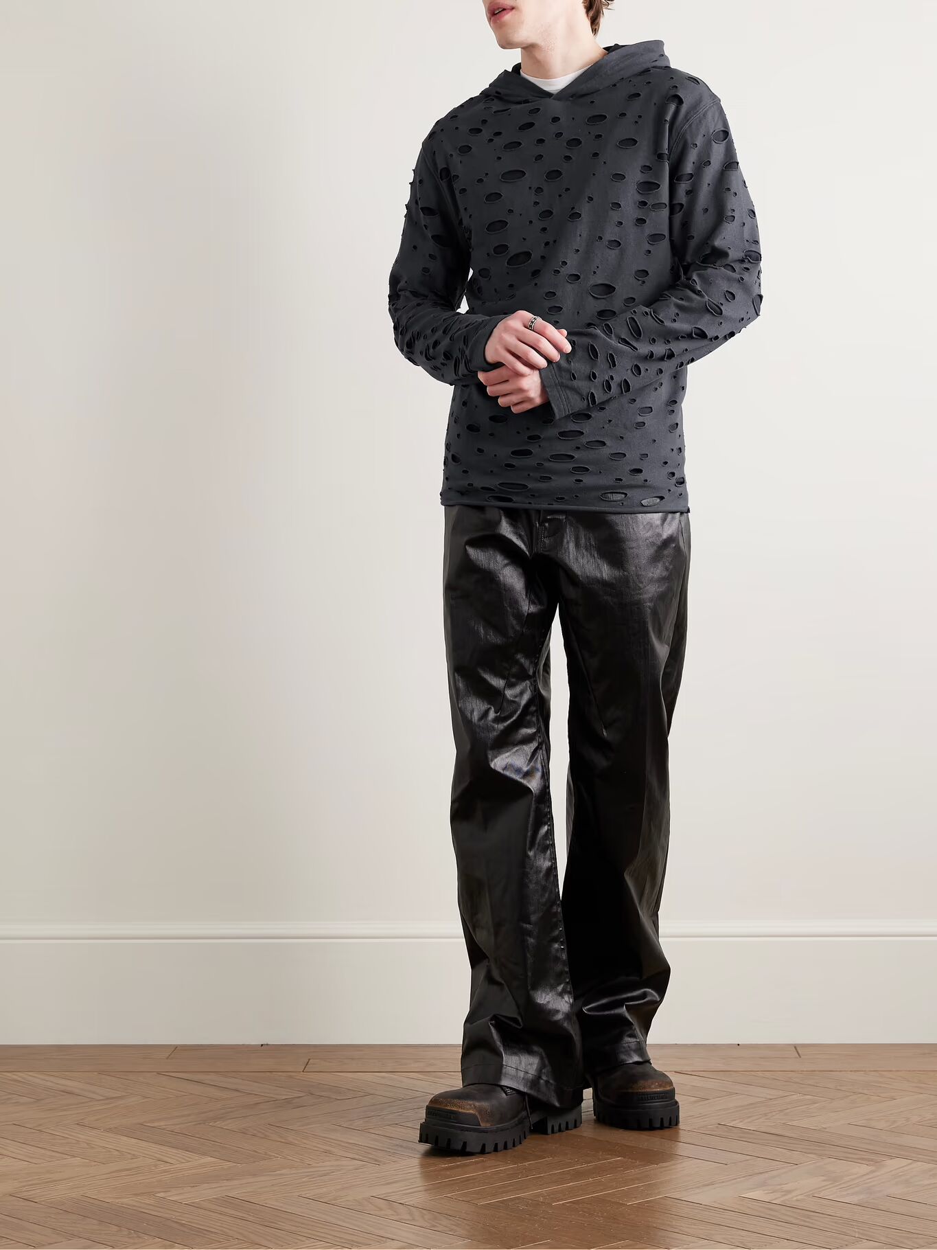 Толстовка Acne Studios 'Eipe' имеет потертости с отверстиями разного размера, обнажая черный слой под ней. Она сделана из хлопкового джерси и имеет тонкую вышивку логотипа на капюшоне.