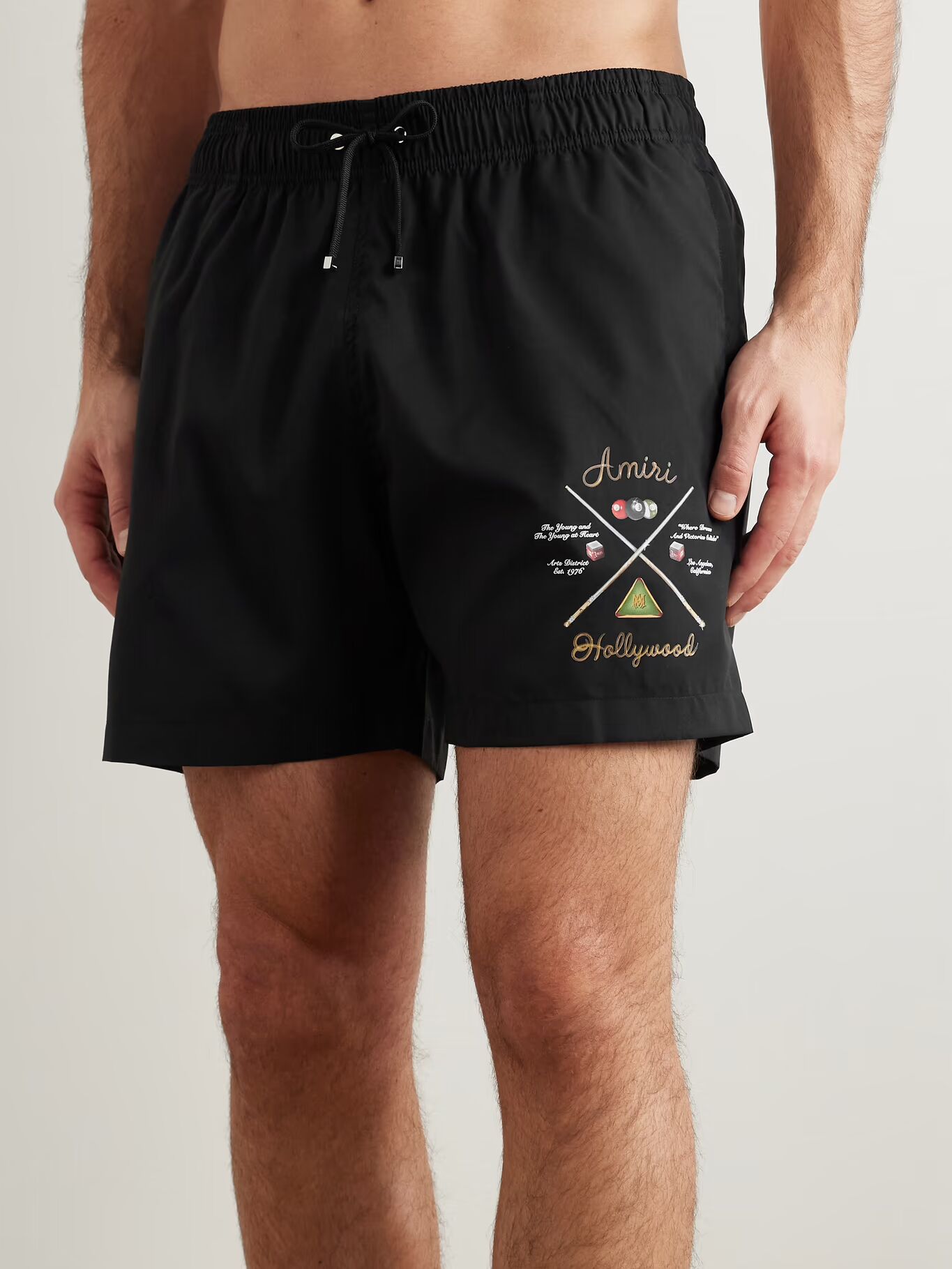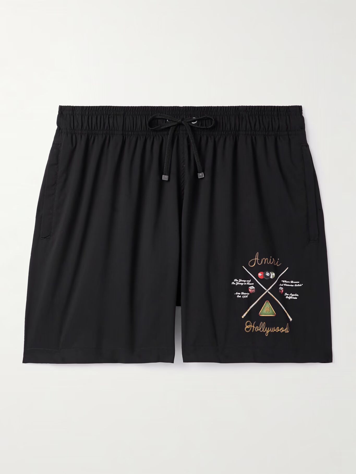 Шорты для плавания AMIRI предназначены для солнечных дней, будь то в Монако или Малибу. Они сшиты из легкой оболочки и напечатаны с фирменным логотипом лейбла «Pool Cue», вдохновленным поздними ночами в Голливуде.